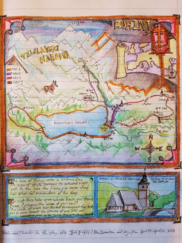 남편이 그린 우리만의 보힌 길-마리안 부부의 방명록에 그려놓은 후 선물로 드렸다. 오른쪽 아래에서 볼 수 있듯이 우리가 묵었던 곳 앞으로 보힌 호수가 펼쳐져 있다.