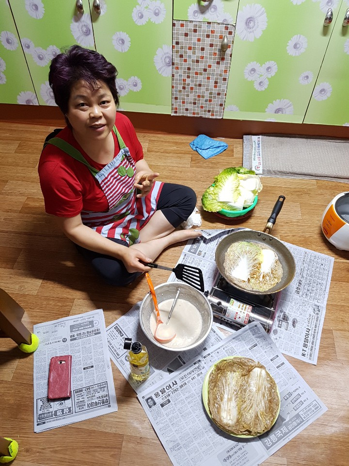 그 옛날 화덕이 있던 자리에 이제는 휴대용 가스버너가 놓여있지만 여전히 맛깔스러운 언니의 메밀전병. 전병을 말기 귀찮을때 후다닥 만들어내는 백김치 메밀전, 그리고 나의 큰언니.