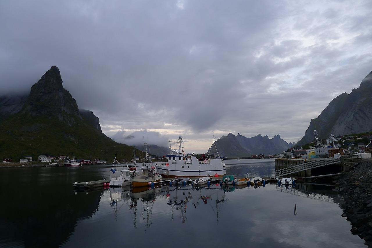 Reine에 아침이 밝아오는 풍경. 구름이 조금씩 거쳐질때마다 새로운 화강암 봉우리들이 모습을 드러냈다. '나 여기 있노라'하며.