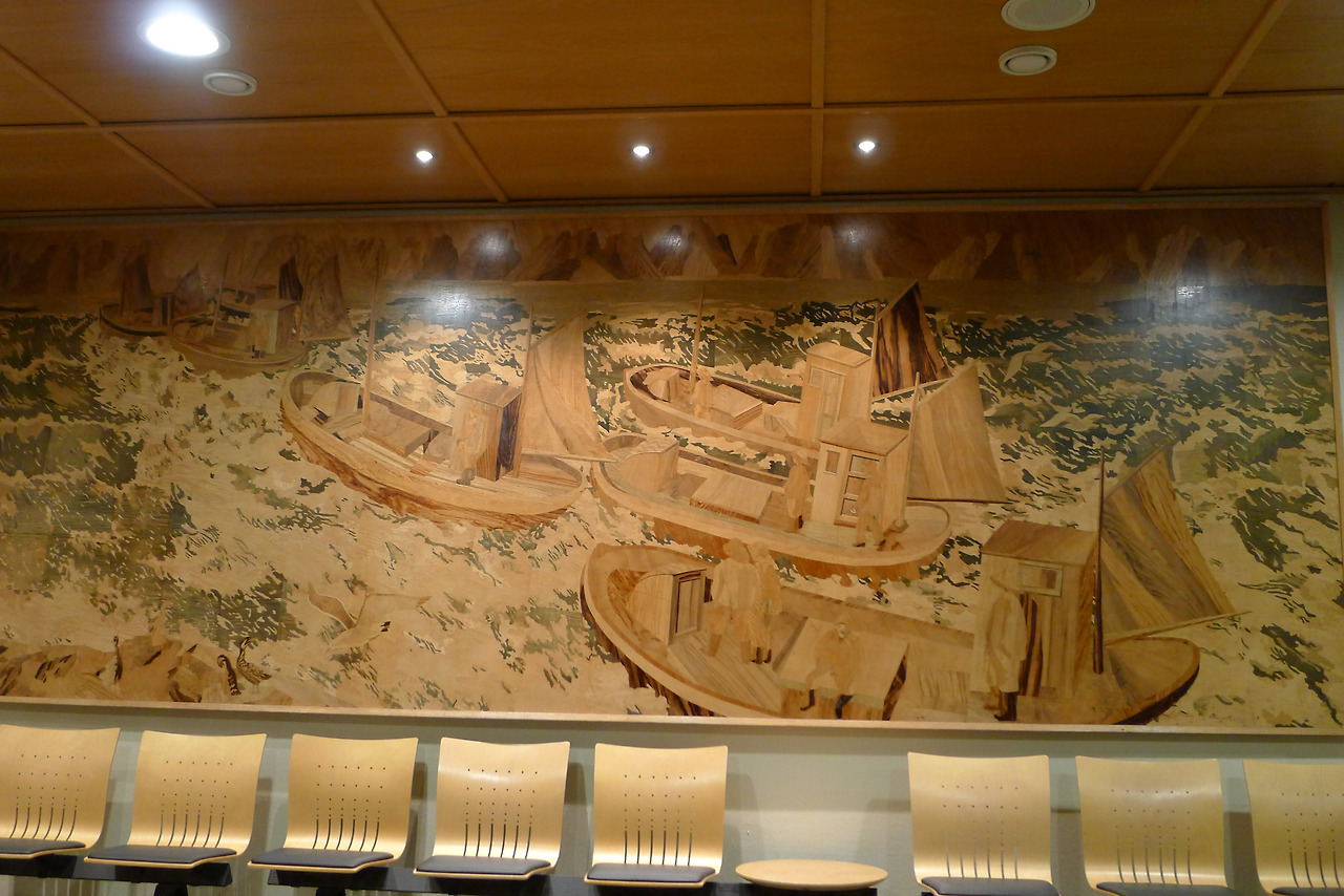 Hurtigruten terminal- 페리를 타기위해 기다린 터미널. 벽에 걸려있는 목조 판화가 인상적이었다. 성난 파도를 헤치며 섬으로 향하는 목선들.