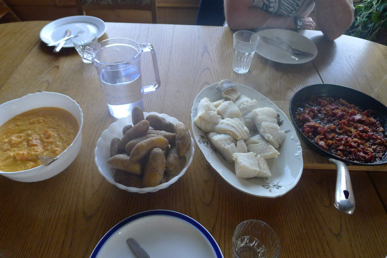 거스 말고 레이크니가 요리 해준 전통 북노르웨이 한 상. 메인 생선요리 루테피스크(lutefisk: 염장 대구 요리) 맛이 환상적이었다.