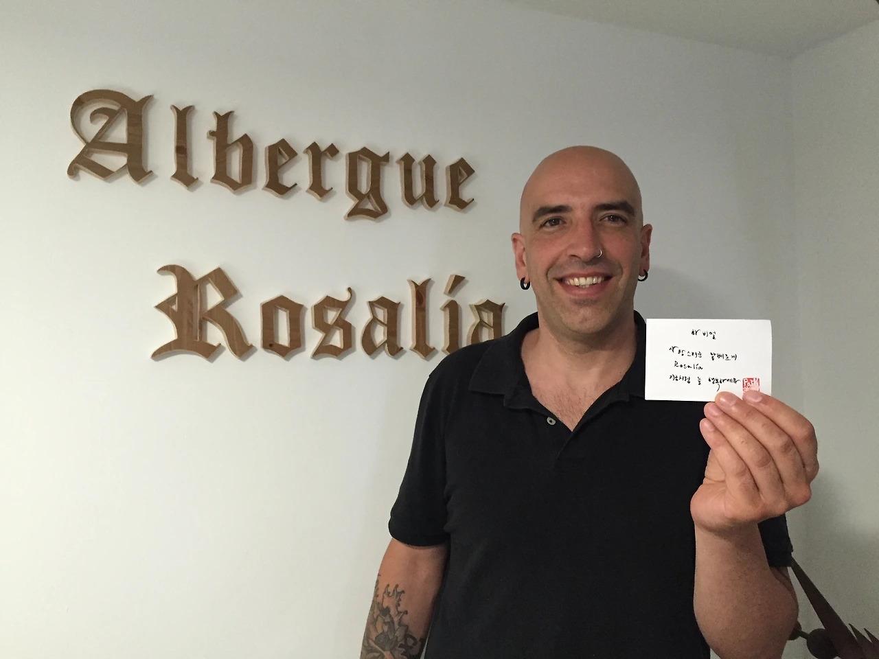 마을에 도착해서 알베르게를 찾다가 팔에 새긴 타투가 멋스러운 하비 얼(Javier)이 운영하는 Albergue Rosalia 에 머물기로 했다. 카운터에는 순례자들이 무료로 물을 마시거나 과일을 먹을 수 있도록 마련되었고, 주인장 하비 얼(Javier)의 깔끔한 운영이 눈에 띄는 좋은 알베르게였다.
