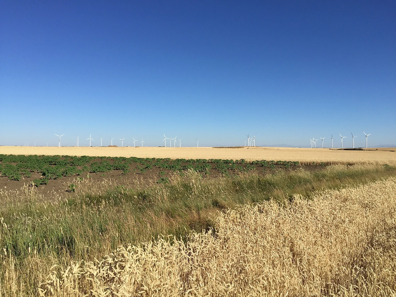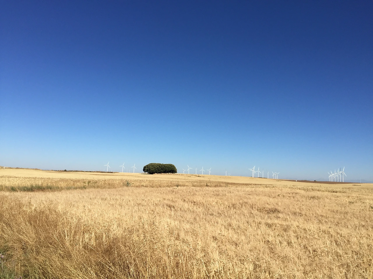 멀리 풍차가 줄지어 바람에 돌아가고, 파아란 스페인 하늘과 들녘이 멋진 풍경을 자아낸다.