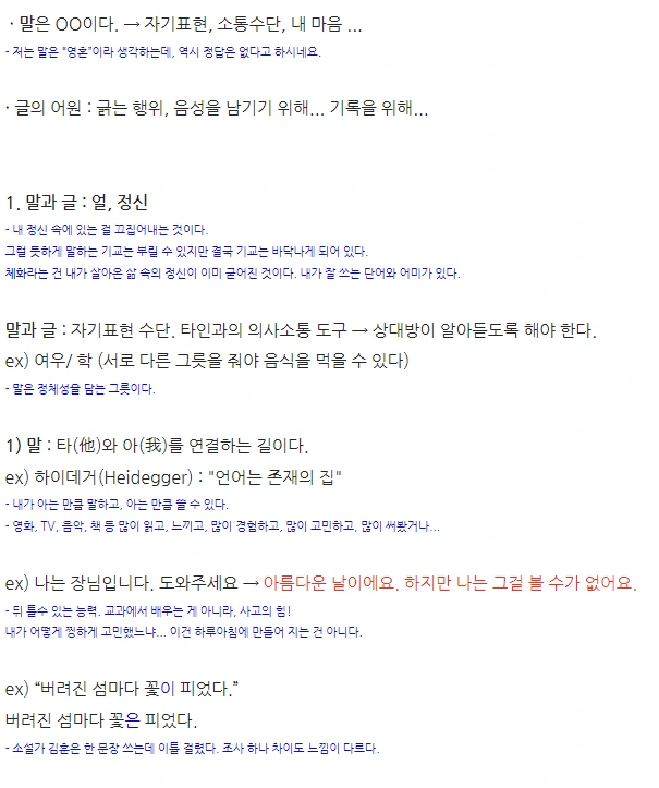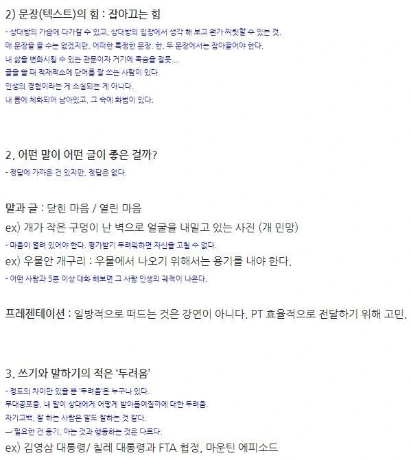 3주 간 매주 월요일 2시간 수업을 들었지만 3주만에 나의 글과 말이 달라졌다고 생각지 않는다. 다만 글을 쓸 때 좀 더 고민하게 되었고, 말을 할 때 좀 더 깊이를 더해 가고 싶다는 생각만은 확실해졌다. 하루아침에 글을 쓰거나 말하는 게 달라질 순 없을 거다. 꾸준히 고민하고 노력해야 할 것이며, 고민한 만큼 나의 글과 말의 품격이 달라질 것이라 믿는다.