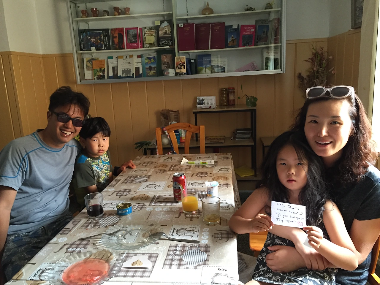 사실 오늘 찬란한 일상을 더욱 아름답게 만들어준 사람책이 있다. 레온에서 크리스티나가 숙소에 체크 인 하는 동안 알베르게에서 만난 한국인 가족이다. 결혼 후 중국에서 14년을 사셨고, 이제 이직하며 한국으로 삶의 터전을 옮기게 되었는데. 그 사이 휴식 겸 산티아고의 순례길에 오게 되셨다고 한다. 같은 한국인이라지만, 처음 보는 우리에게 선뜻 샌드위치와 음료수, 그리고 시원한 수박을 건네며 같이 먹자고 해주셨다. 마침 배도 고프고 지친 참에 염치 불고하고 아주 맛있게 먹었다. 먹고 보답으로 캘리그래피를 써드렸는데. 다음에 다시 뵙게 되면 꼭 다시 뭔가 보답을 드려야지,라고 그 날 일기에 썼다. 그런데 인연이었던지. 이후에도 몇 번 더 만나게 된 민찬, 민 채네 가족.
