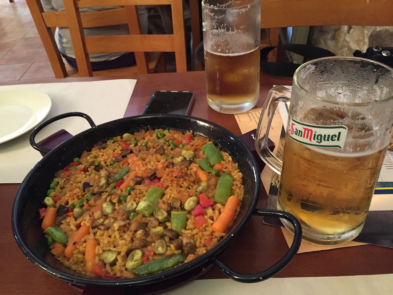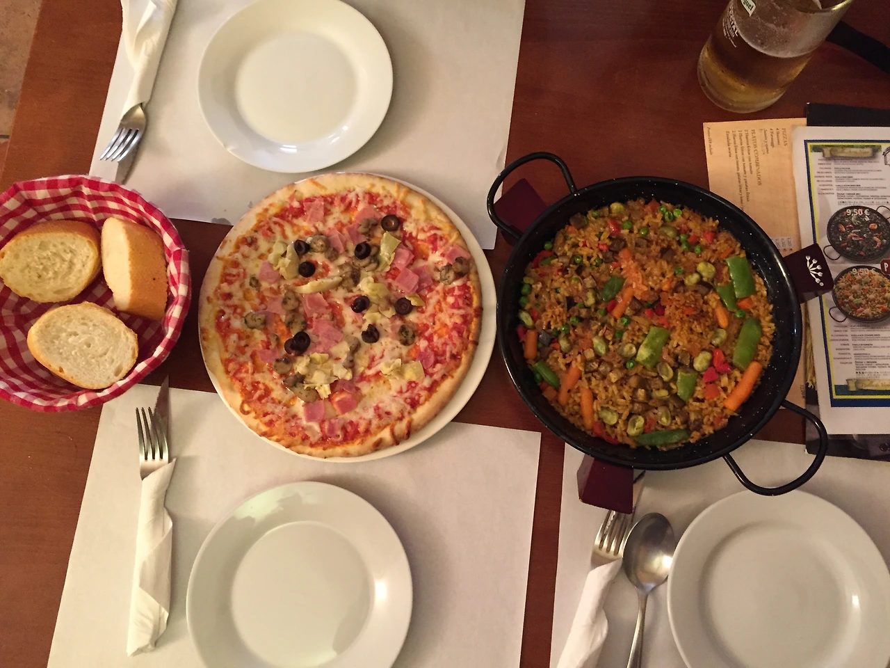 심사숙고해서 고른 레스토랑에서 빠에야와 피자와 맥주를 마셨다.