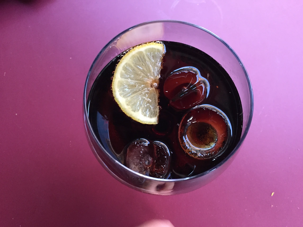 나는 얼음이 동동 띄어진 맥주를 휘는 얼음과 레몬이 띄어진 콜라를 마셨다.
