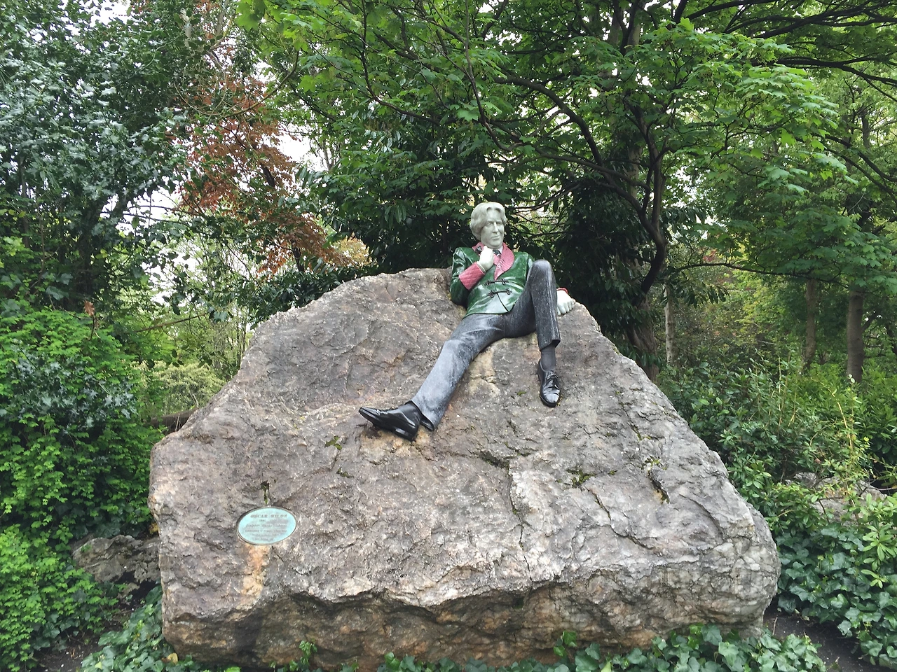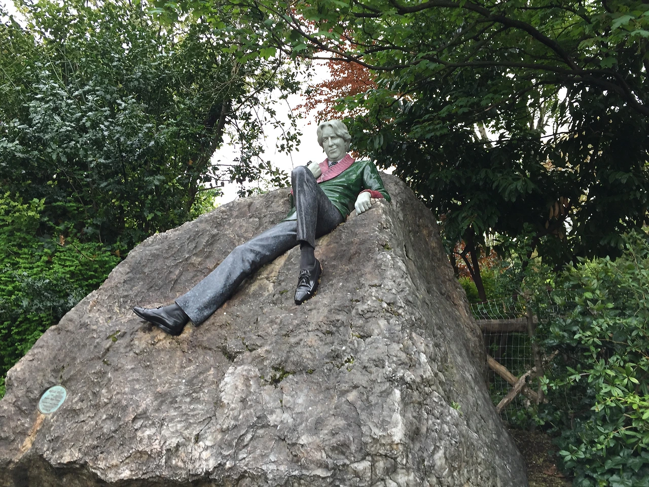 오스카와일드의 어머니는 유명한 시인이고, 아버지는 대학교수이자 유명한 안과의사이자 고고학자였다. 이렇듯 명문가에서 태어난 그가 태어나고 살았던 집터가 더블린에 있다. 그리고 그의 생가 맞은편에 위치한 메리온 스퀘어 공원엔 자신이 나고 자란 집이 잘 보이는 바위 위에 익살스러운 표정의 오스카와일드(기념 동상)가 걸터앉아 있다.
