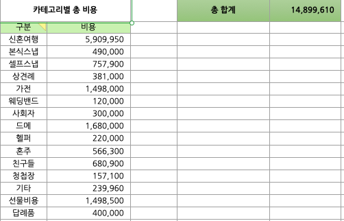 결과적으로 든 총 비용은 1,489만원! 예산보다 약 300만원 정도 더 쓰긴 했지만, 예산을 잡고 쓴 덕에 이정도 선에서 마무리가 될 수 있었다고 생각해요. 결혼을 준비하다보면 정말 선택이 연속이고 어떤 선택을 하느냐에 따라 비용이 천차만별이 되는데요. 어떤 항목들에게 크게 줄일 수 있었는지 공유해드릴게요.