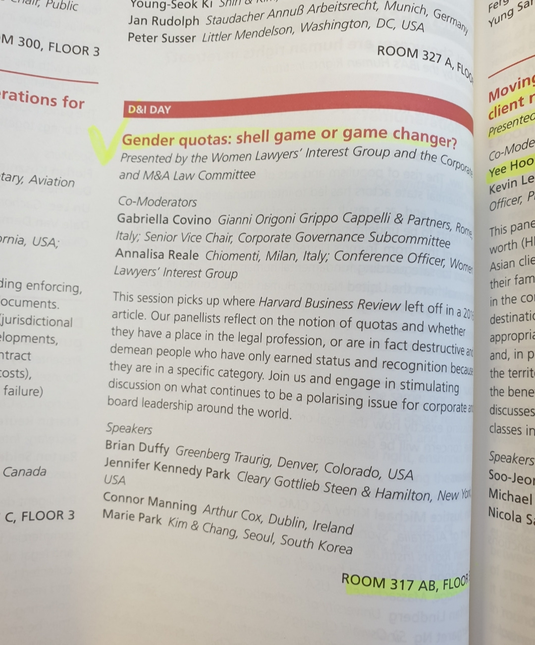그 중 여성변호사 위원회에서 주최하는 세션 주제 중 하나가 바로 “Gender Quotas: Shell game or game changer?”로 위 KBS 스페셜에서도 언급한 여성임원할당제와 연결되어 있습니다.