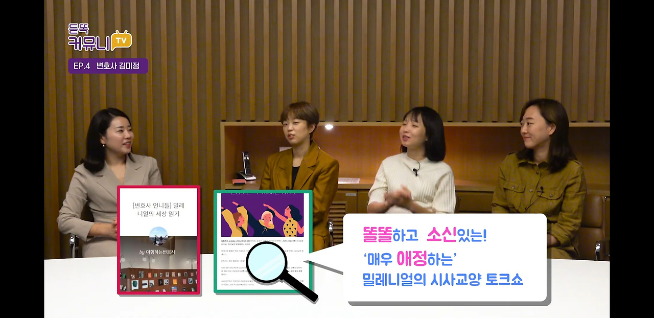 이미<변호사언니들>인스타그램에서 전한 소식이기도 한데, 지난 <밀레니얼의 세상읽기> 편에서 소개했던 JTBC 출신 여기자들이 운영하는 밀레니얼 시사교양 팟캐스트 <듣똑라>(듣다보면 똑똑해지는 라이프)에서 애청자(듣똑러)들을 찾아가서 듣똑러들의 삶과 일상에 관한 이야기를 나누는 "듣똑커뮤니TV"에 출연하게 된 것이다.