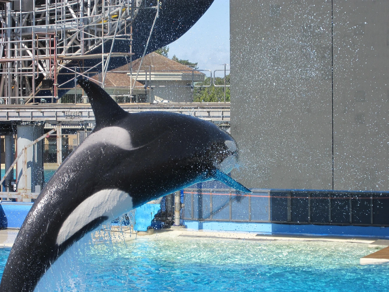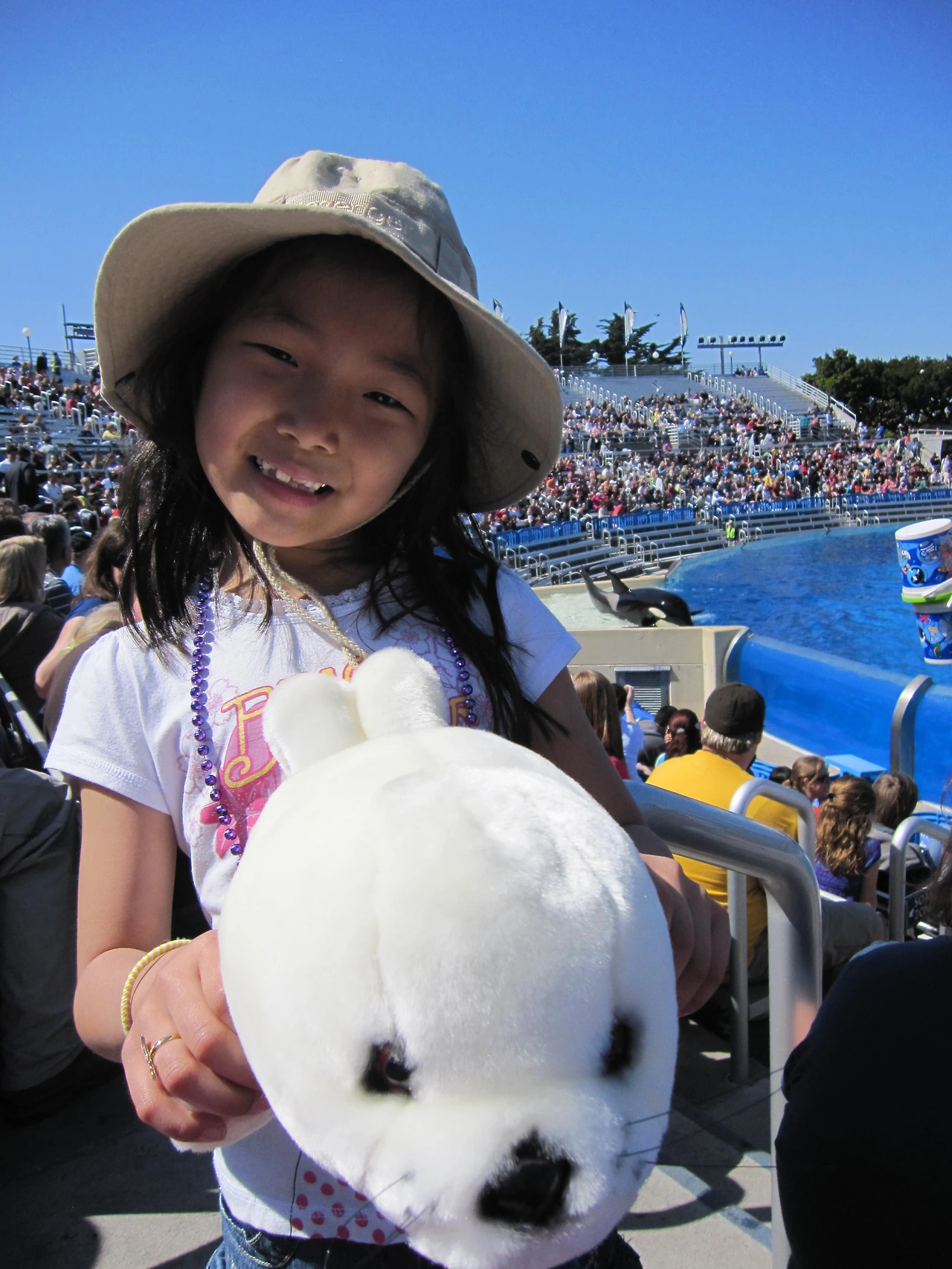 샤무(Shamu)는 사진에 있는 것처럼 덩치는 무지무지 크고 멋지게 생긴 까맣고 하얀 고래인데, 이게 killer whale이란다. 실제로 조련사를 죽인 적도 있다고.. 이 고래가 덩치도 크고, 힘도 너무 좋아서, 쇼 중간에 꼬리지느러미를 이용해서 관객들한테 물을 뿌리는데, 정말 그 힘이 장난 아니었다. 이 물세례가 워낙 유명해서, 쇼 시작 전에 우비까지 판다. 우리도 앞자리여서(워낙 인기라 30분 전에 입장했다는 거) 걱정했었는데, 다행히 우리까지는 물이 튀지 않았다.