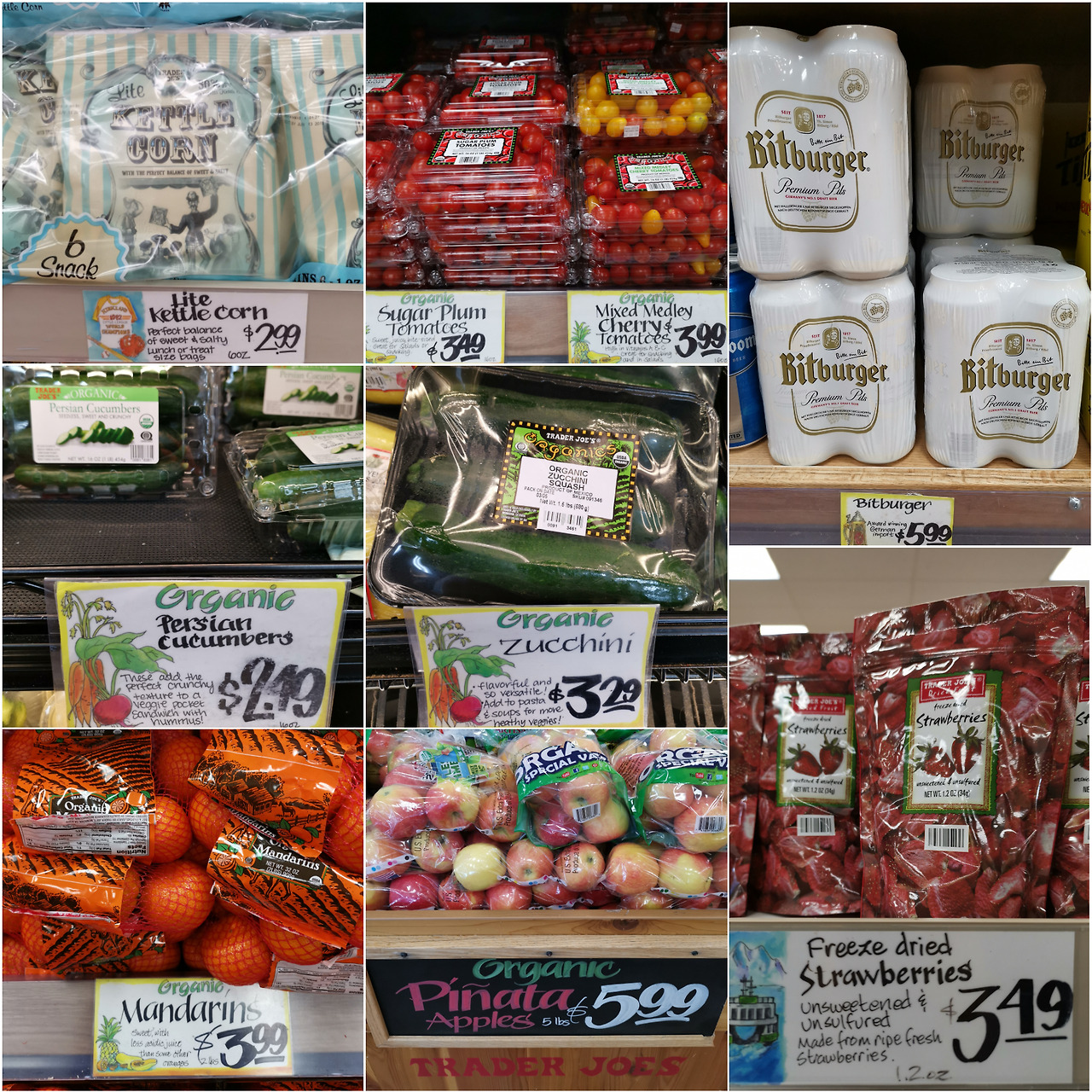 이 착한 가격을 보라Trader Joe's는 대부분 자체 제작 식료품을 저렴한 가격에 판매하는 마트다. 유기농 식자재도 일부 있어서 주키니, 오이, 사과(pinata는 여기만 있음) 등은 여기서 구매하는 편이다. 부드러운 과일 종류는 맛이 별로 없어서 여기서는 구매하지 않는다.