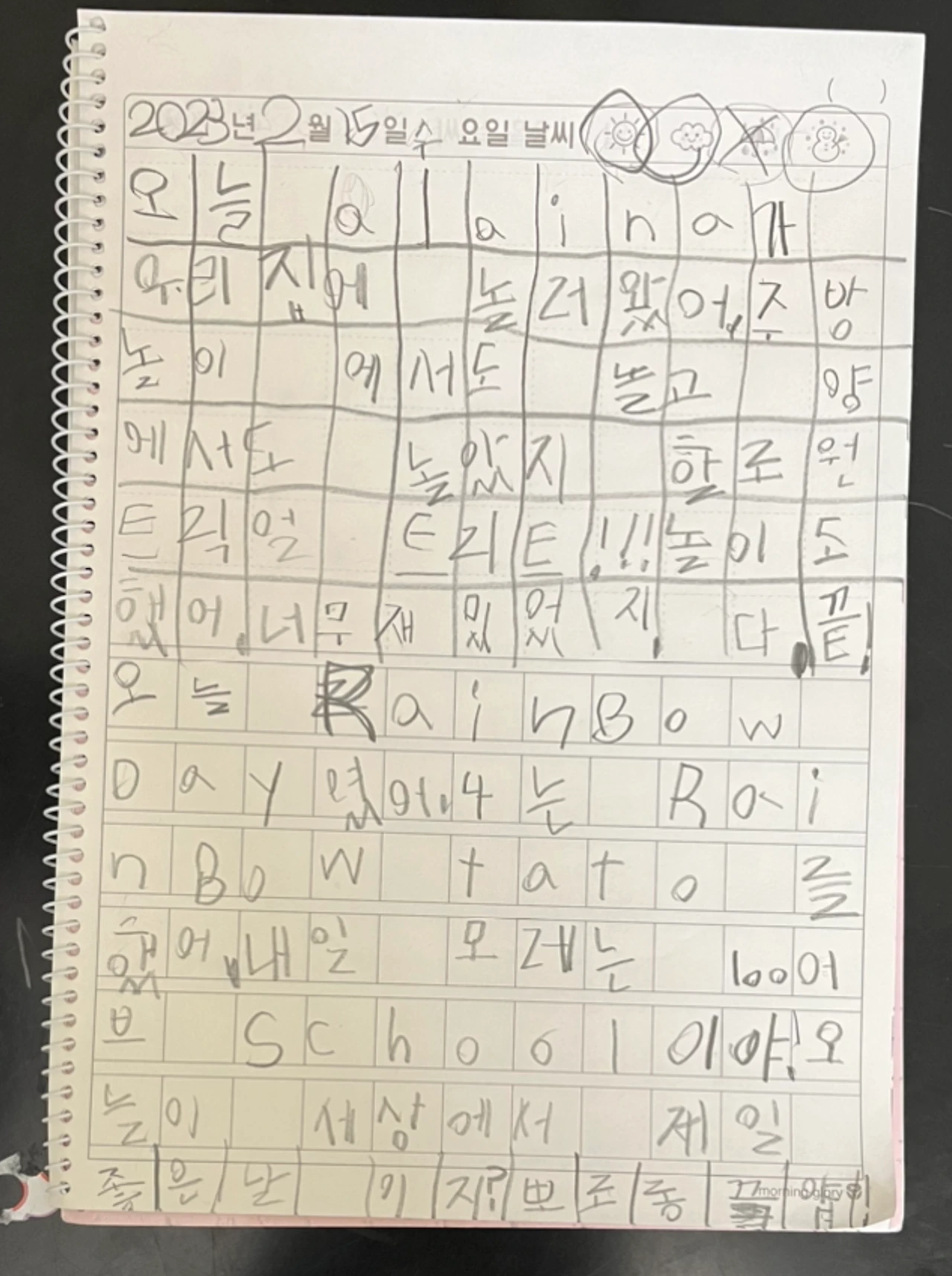 세 집 건너에 사는 이웃이라서 같이 걸었다. 아이들은 이미 손잡고 재잘재잘 앞서 걷는다. A의 오빠가 수요일마다 플레이데이트를 하는데, 오늘은 본인 집이 비어서 A의 요청을 들어주고 싶었다고 한다. 교실에 자원봉사를 가 보니 꼬꼬가 글씨 쓰기를 너무 잘한다며 칭찬을 하길래 웃으며 고맙다고 답했는데, 도서관에서 보니 A가 발표를 너무 잘하더라고 맞칭찬을 했어야 했다. 이불킥을 해본다. 꼬꼬가 음악시간을 좋아하냐고 물어서 그냥 그런 것 같다고 했더니, A는 음악 선생님을 별로 안 좋아한다며 이제 곧 원래 음악 선생님이 돌아올 거라고 했다. 지금 음악 선생님이 임시인 건 처음 알았다. 실제로 엊그제 음악 선생님이 바뀐다는 공지를 받았다. 이것이 엄마들의 정보력인가.
