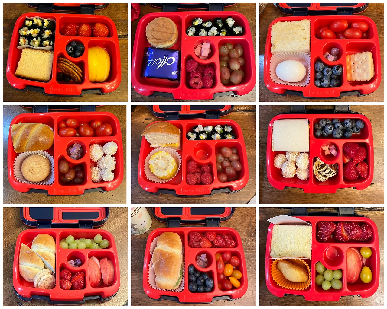 프리스쿨 다닐 때부터 도시락을 쌌기 때문에 킨더도 당연히 도시락을 챙겨 보낼 생각을 하고 유료 급식에 대해서는 전혀 고려해보지 않았다. 견과류가 들어가면 안돼서 이것저것 도시락 구성을 바꿔보다가 요즘은 꼬마김밥 몇 개, 빵이나 크래커, 과일들로 간단하게 보낸다. 점심시간이 15분뿐이라서 다 먹지 못하고 가져오는 게 부지기수라 꽉꽉 채울 필요가 없다. 그래도 집에 신선한 과일과 빵, 아보카도가 떨어지지 않게 자주 확인해야 한다.