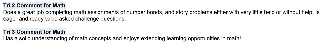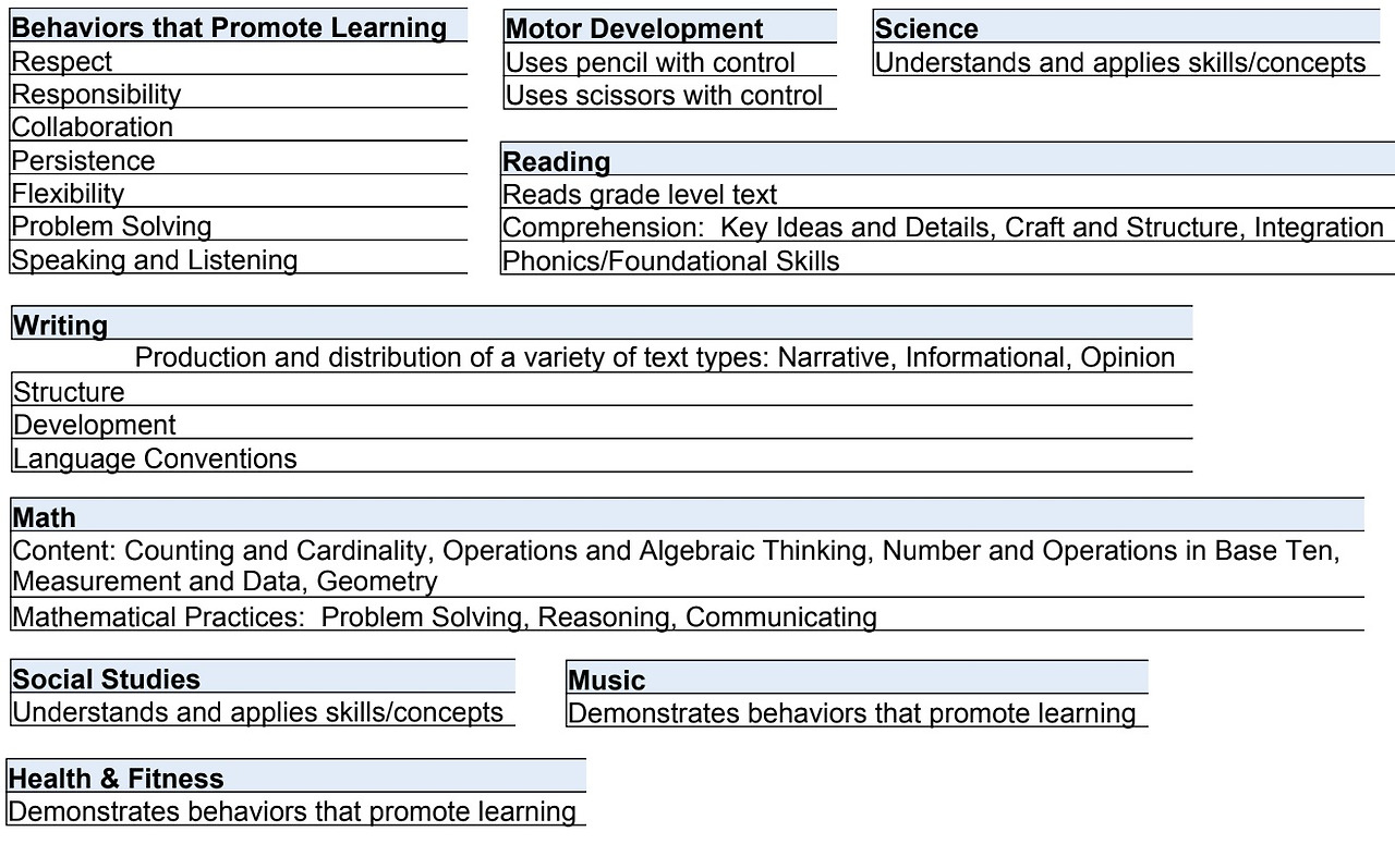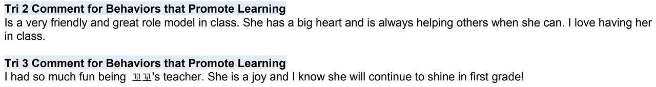 미국 학교는 한 학년이 3학기로 운영되는데 3월 중순에 2학기가 끝나면서 한 번, 6월에 학년이 끝나면서 한 번 Report Card가 나왔다. 등수를 매기는 건 아니고 아이가 각 항목들을 어느 정도로 수행하는지에 대한 기록 정도였는데 선생님의 평을 통해 아이의 발달사항을 가늠할 수 있었다.