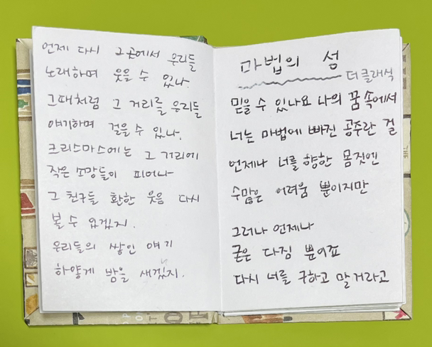 이동할 때 우리가 튼 노래를 듣고 마법의 성(더클래식)이나 크리스마스에는(이승환), 옛 친구에게(여행스케치) 같은 노래를 따라 부를 땐 어쩐지 기특한 마음마저 들더니, 아이가 팝송을 따라 부를 때 내 마음에 나타나는 이 감정은 뭐란 말인가. 약간의 상실감과 함께 아이가 훅 멀어질 것 같은 기분이 든다. 아이는 십 대를 향해 걸어가고 있고 미국에 살고 있는데 인기 있는 팝송 부르는 게 뭐 대수라고. 아이브의 아이엠을 부를 때도 너무 귀엽다 했으면서 아직 팝송까지는 내 마음의 문이 안 열렸나 보다. 인정하면서 아이와 같이 부를 가사책을 만든다. 인정했지만 팝송을 적진 않는다.