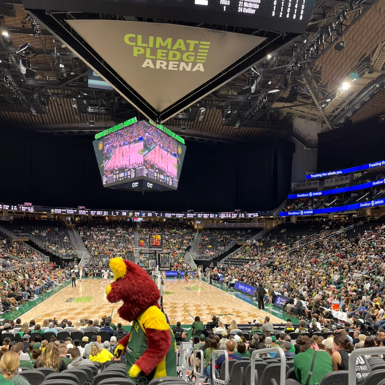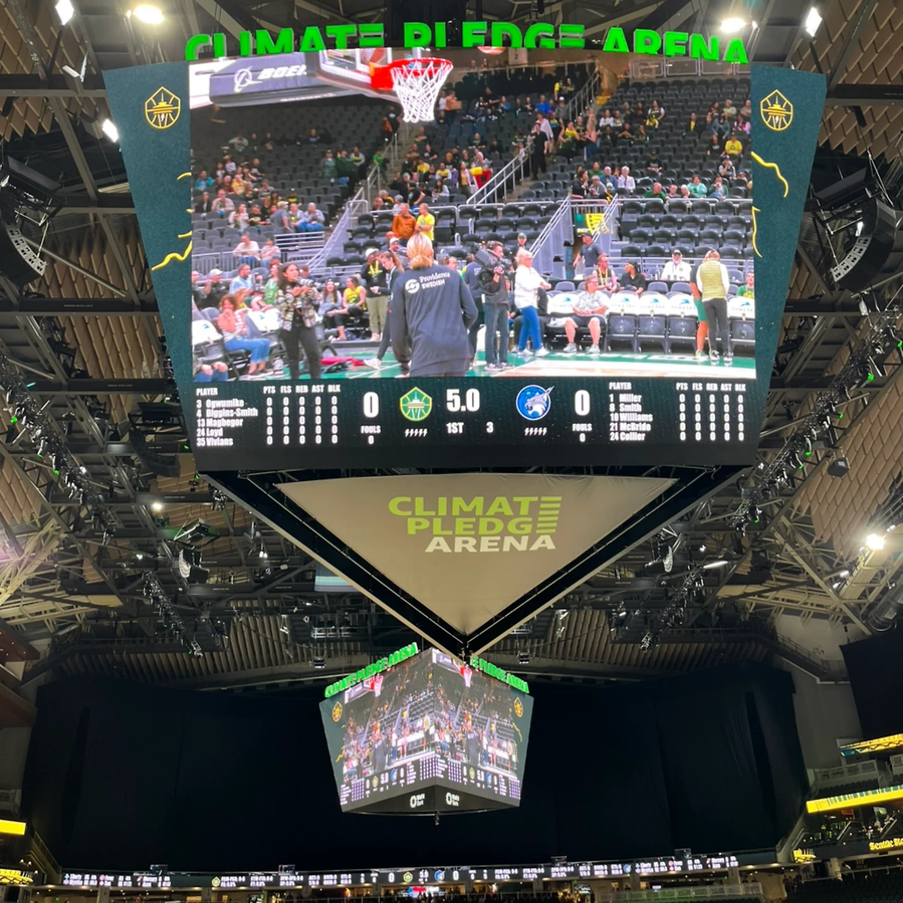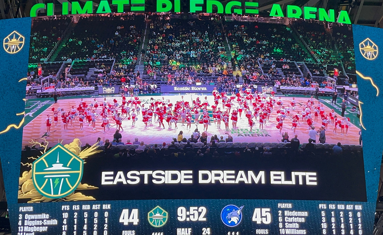 Seattle Storm과 Minnesota Lynx의 농구 경기는 스페이스니들 옆 CLIMATE PLEDGE ARENA에서 열렸다. 경기는 7시 시작이지만 문은 5시 반부터 열어서 짐검사와 티켓 확인을 하고 들어가서 치어리더들은 모두 모여 몸을 풀었다. 경기 시작 전 선수 소개를 할 때 티켓을 많이 구입한 몇몇의 치어리더들이 코트에 내려가 선수 뒤에 서 있거나 공을 받았다. 그 모습을 나머지 치어리더들이 관중석에 앉아 직관(이런 자본주의)하였고 1 쿼터가 끝나자 대기석으로 이동했다. 아이들의 공연을 정면에서 보려면 14번 섹션에 가야 한다는데 13~15번 섹션은 WaFd Bank club(이런 자본주의)으로 아무에게나 개방되는 공간이 아니었다. 난 그냥 자리에 앉아 전광판으로 아이의 공연을 지켜보고 남편은 최대한 가까이 가서 영상을 찍었다. 14번 섹션에 갔어도 내 아이는 못 찾았을 것 같다. 치어리더들이 너무 많고 맨 뒤쪽에 있는 우리 아이는 그마저도 큰 아이들에 가려 도통 보이지가 않았다.