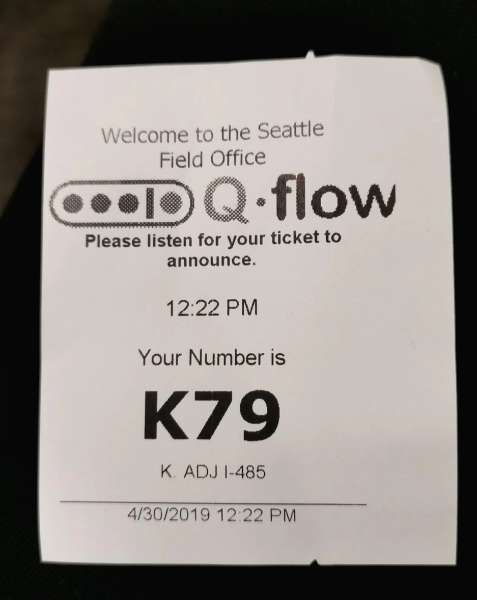 아이에게 오늘 어떤 사람을 만나러 갈 건데 중요한 이야기를 할 거니까 그때만 조용히 있어 달라고 몇 번 부탁을 했다. 차에 태우니 낮잠도 딱 맞게 자 주어 순조롭게 인터뷰에 임할 수 있을 것 같았다. 인터뷰 시간은 12시 45분이었고 30분 이상 일찍 오지 말라고 쓰여 있어서 15분에 들어갔다. 공항 검색대처럼 신발까지 벗고 입구를 지나, interview notice letter를 직원에게 보여주면 이렇게 생긴 번호표를 준다.