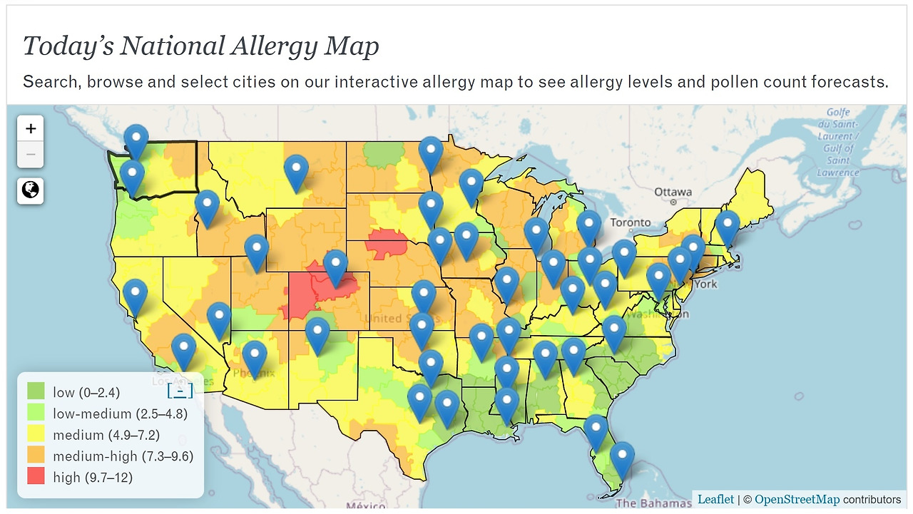 8월 2일자 미국 알레르기 지도 - 출처 : https://www.pollen.com/map