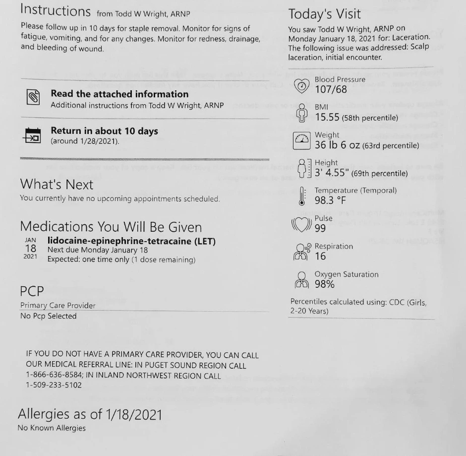 병원으로 가는 동안 아이는 어느 정도 진정이 됐고 지혈도 거의 되어가고 있었다. 병원에 도착해서 접수를 하는데 X-ray나 MRI 등의 장비가 없어서 그걸 쓰고 싶으면 대형병원 응급실로 가라고 하는 게 아닌가. (하... 그 얘긴 전화했을 때 하던가!) 정밀촬영 여부는 의사가 결정할 일이지 접수 데스크에서 결정할 일은 아닌 것 같아서 진료를 일단 받겠다고 했다. 병실에서 간호사가 아이 상태를 확인하고 상처부위를 식염수로 씻어낸 뒤 의사가 왔다. 어떻게 다친 건지 자세하게 묻고 상처 주변을 눌러보더니 아이가 아픈 거 외엔 다른 증상이 없어서 스테이플로 봉합만 하면 되겠다고 했다. 마취크림을 바르고 약간 기다린 뒤 아이를 내가 안고 의사가 스테이플러로 상처부위를 찍기 시작했는데 마취가 다 안됐는지 찍을 때마다 아이가 너무 아파했다. "엄마 너무 아파요"가 아직도 들리는 것 같다. 왜 이럴 때 존댓말 하니 더 마음 아프게.