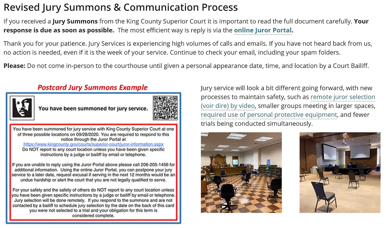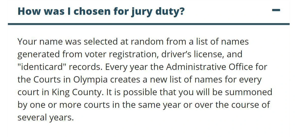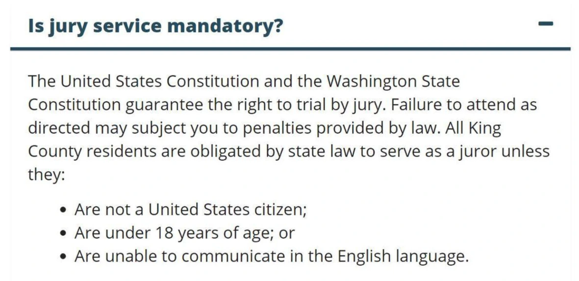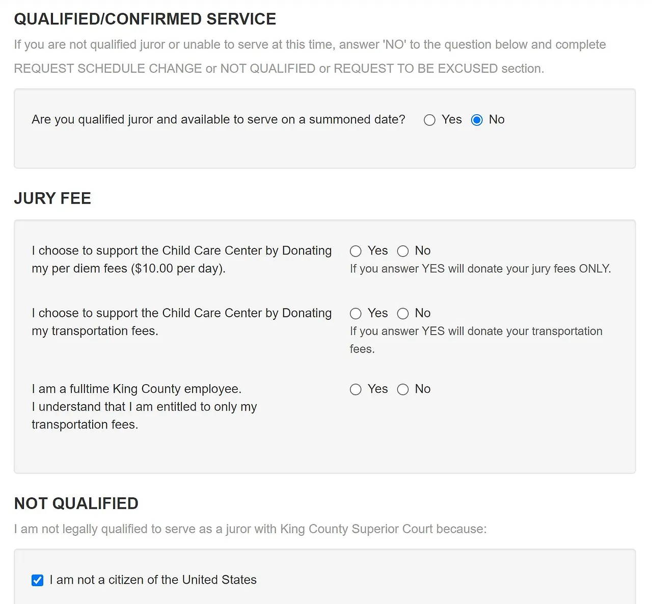 킹 카운티의 배심원 정보 기입 사이트에 들어가서 Badge Number와 생년월일을 기입하면 이메일과 전화번호를 입력하는 화면이 나온다. 정보를 넣고 submit 하면 배심원으로 활동할 수 있는 사람인지 몇 가지 물어보는 항목이 있는데, 무자격자임을 판정받을 거라서 중간쯤으로 내려 QUALIFIED/CONFIRM SERVICE 항목에 No 체크하고, NOT QUALIFIED 항목에 해당하는 사유를 체크하면 된다.