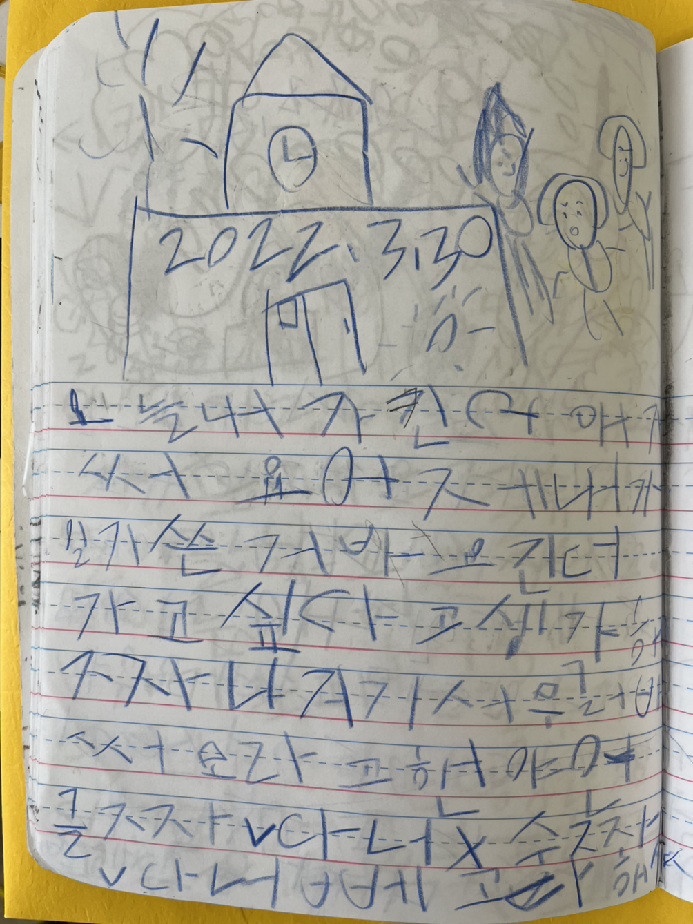 오늘 내가 킨더에 갔어요. 어제 내가 일기 쓴 거 봐요. 킨더 가고 싶다고 생각했잖아. 거기서 물어봤어. 뭐라고 했냐면 글자, 단어, 숫자. 단어 빼고 다 했어.