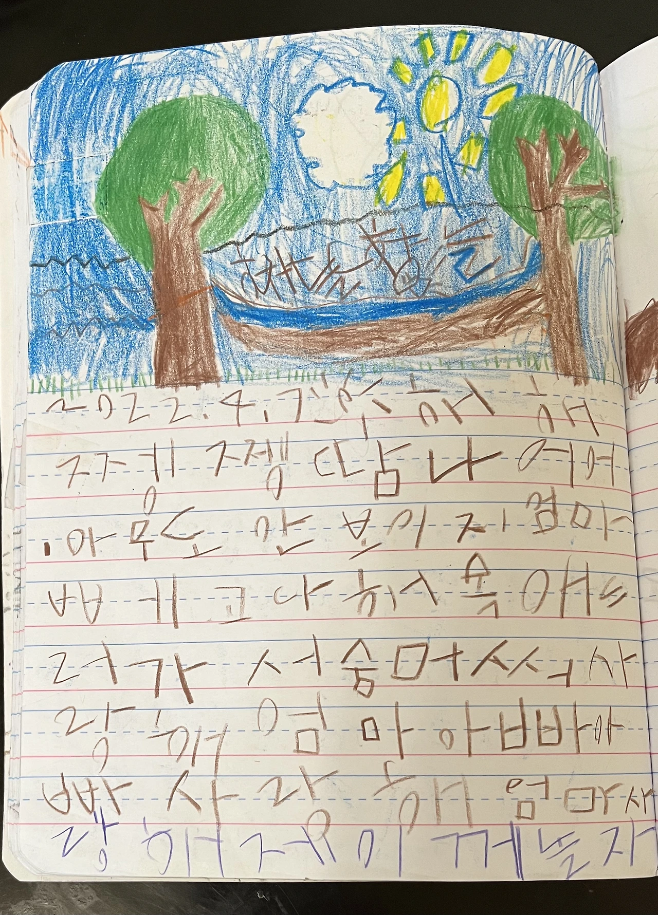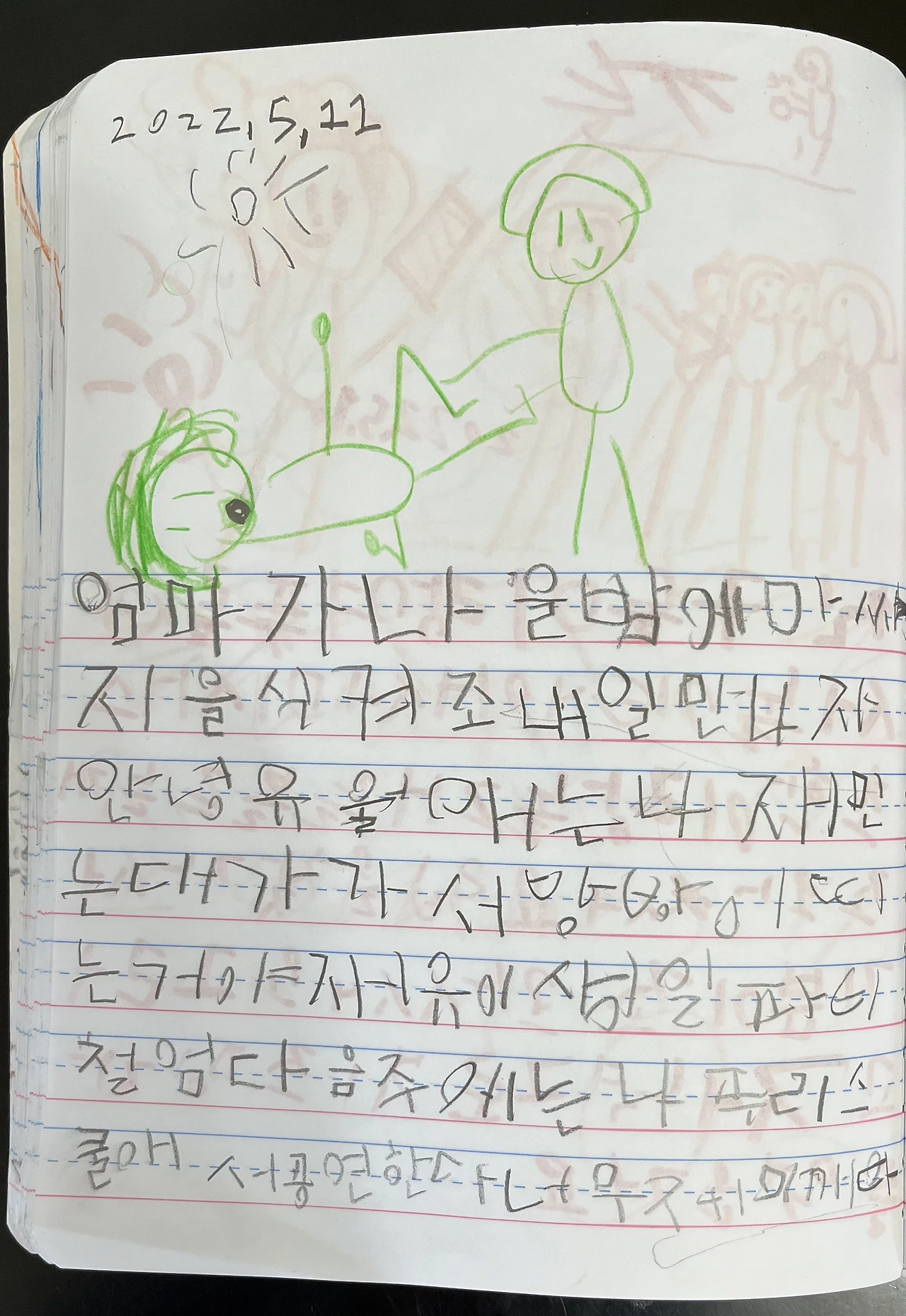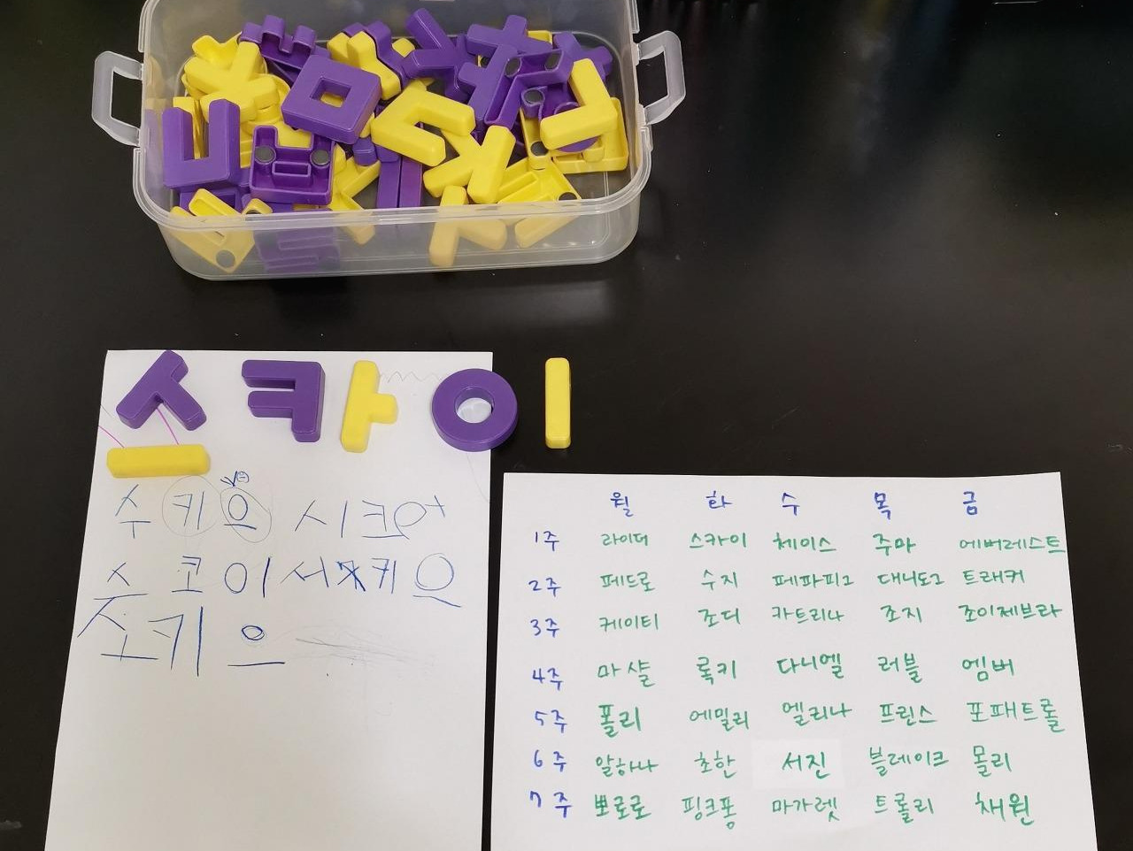 받침 없는 이름들을 앞쪽에 배치하고 하루에 하나씩 배우는 걸 목표로 했다. 그날 배우는 이름의 자모 소릿값을 각각 익히고, 자음과 모음의 배치를 바꿔서 여러 글자를 만들어서 익혔다. [스카이]를 배우면 스커이, 서키으, 소크이 등도 같이 익히는 식이다. 글자를 읽고 만드는 걸로 마치려고 했는데 아이는 자신이 배운 글자를 꼭 펜으로 썼다. 아이가 처음에 말했듯이 쓰고 싶어서 글자를 배우는 것 같았다. 그렇게 계획한 7주가 지나자 어느 정도 읽고 쓰기가 가능해져서 아이에게 그림일기를 써보겠냐고 물으니 덥석 응했다. 처음엔 본인이 쓴 글자들이 맞는지 확인받고 싶어 했는데 틀리는 게 당연하고 점점 알아가는 게 재미있는 거라 설명하니 수긍하기는 했다. 다만 불편한 마음은 남아있는 거 같아서 두 개까지는 물어보면 고쳐주겠다고 하는 기간이 몇 주 있었고, 그 후로는 "일기"의 의미에 걸맞게 혼자서 잘 쓰고 있다. 나는 아이에게 허락을 받고 그의 일기를 읽고 사진 찍고 즐거워한다.