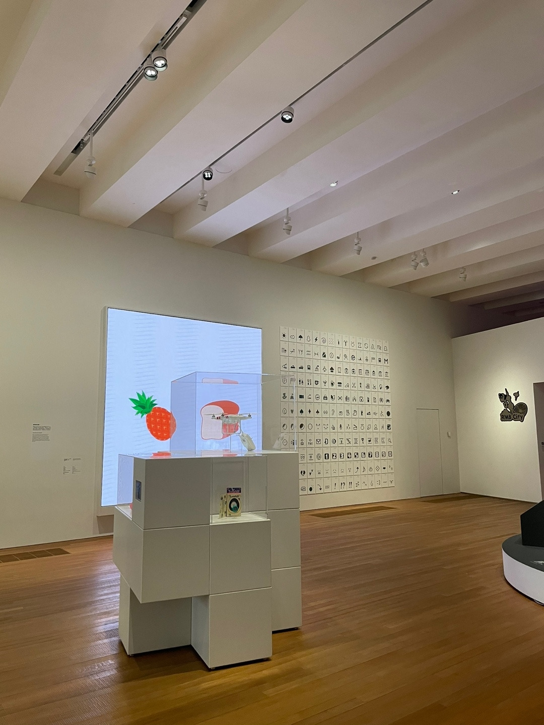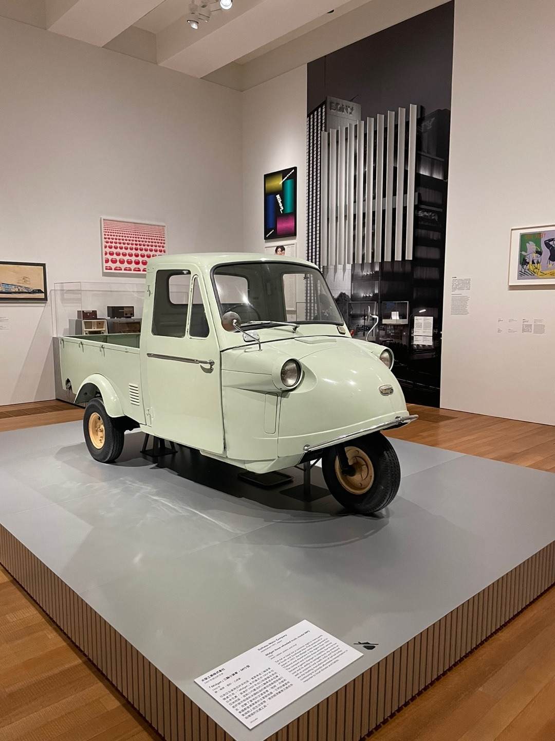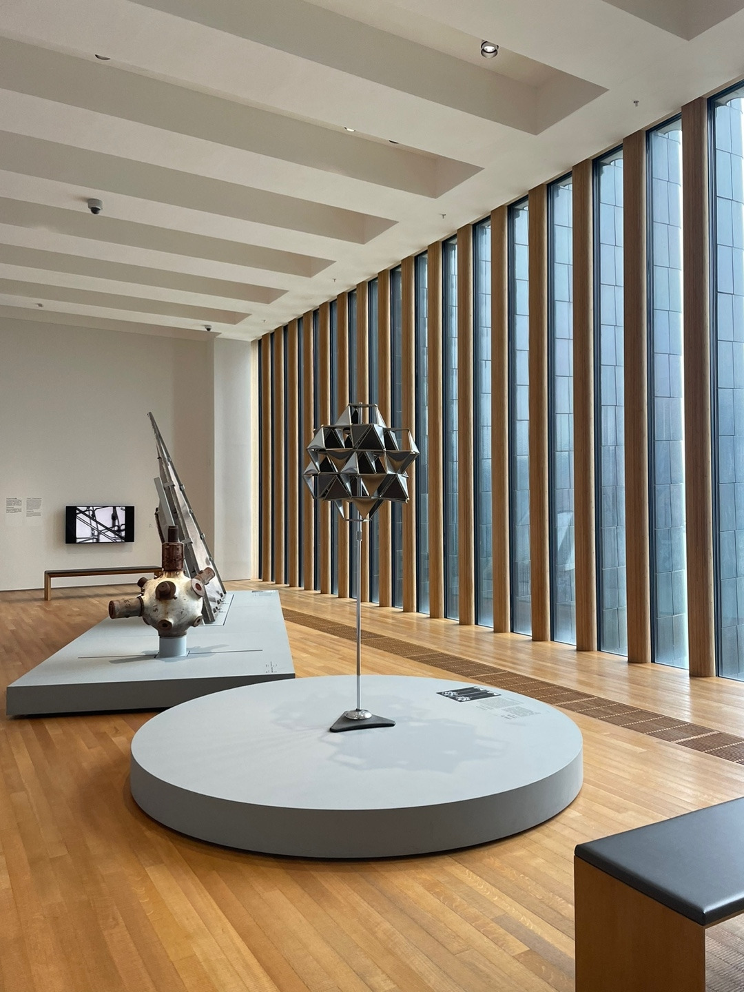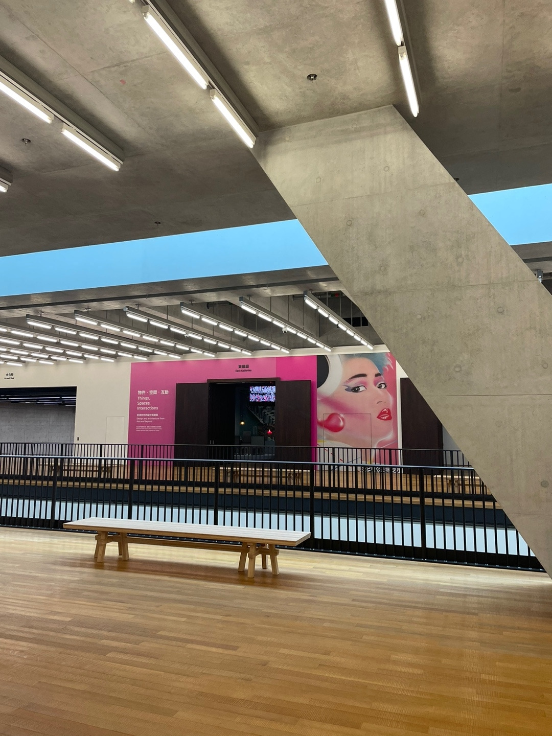 벽면에는 중국의 건축 스튜디오 드로잉 아키텍처가 커미션 작업의 일환으로 과거와 현재를 연결하는 콘셉트의 대형 벽화를 설치했다. 또 마치 조각처럼 설치된 삼각형 패널은 1970년 일본 오사카 국제박람회의 엑스포 타워 ‘카빈’에서 추출한 건축 재료다. 설계자이자 메타볼리스트 무브먼트를 이끈 창립 멤버 중 하나인 Kikutake Kiyonori는 타워가 철거된 이후 이 패널을 보관하고 있다가 엠플러스에 제공했다. 오사카 국제박람회는 전후 테크노-퓨처리스틱 건축을 선보이는 쇼케이스로 기능했다는 점을 강조하기 위한 설치물이다.