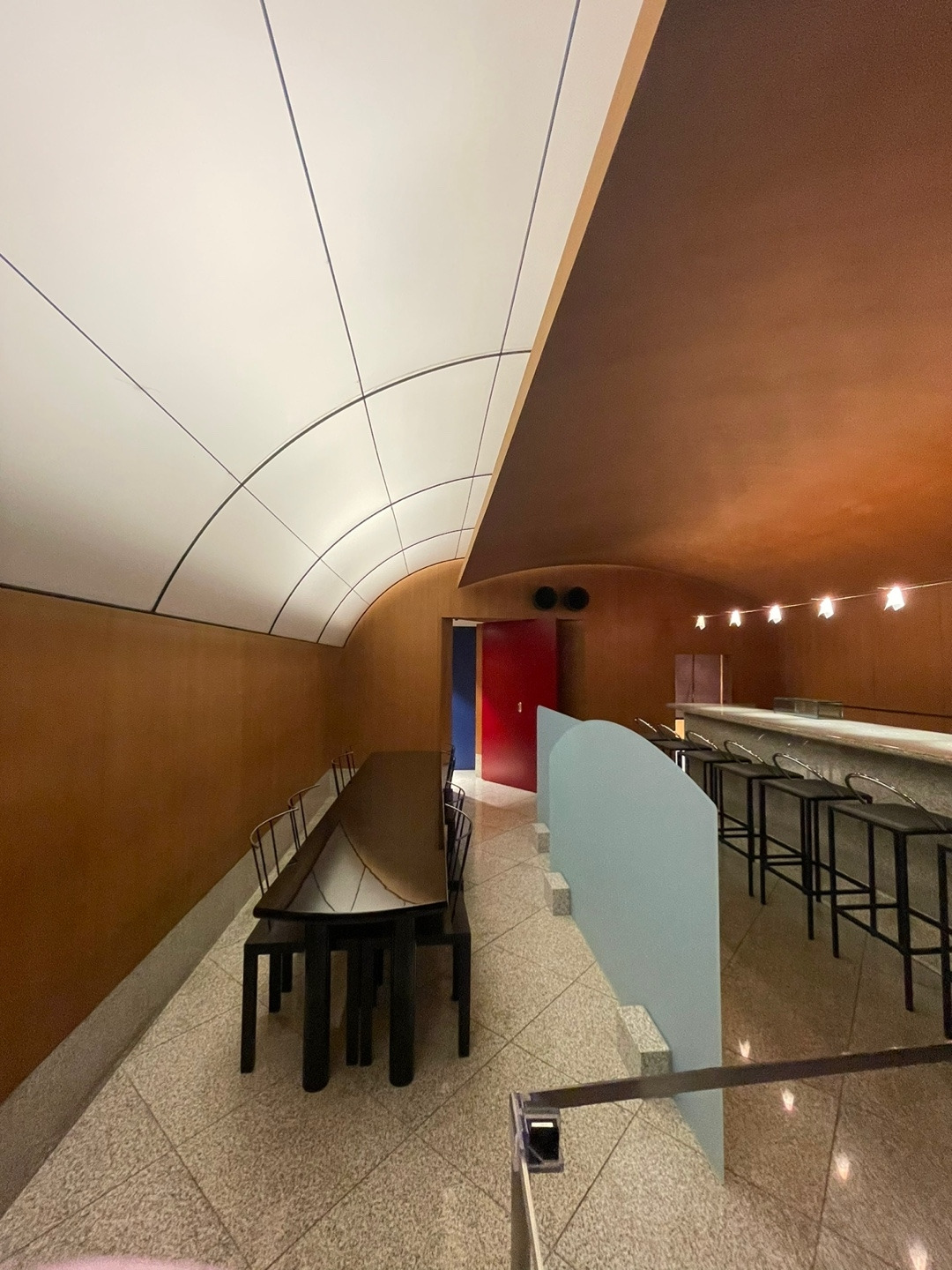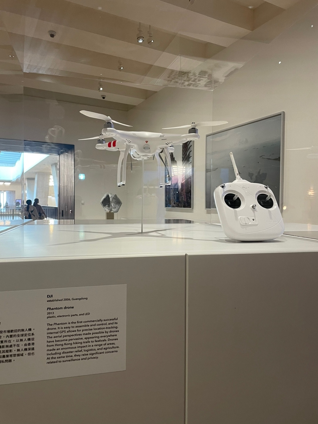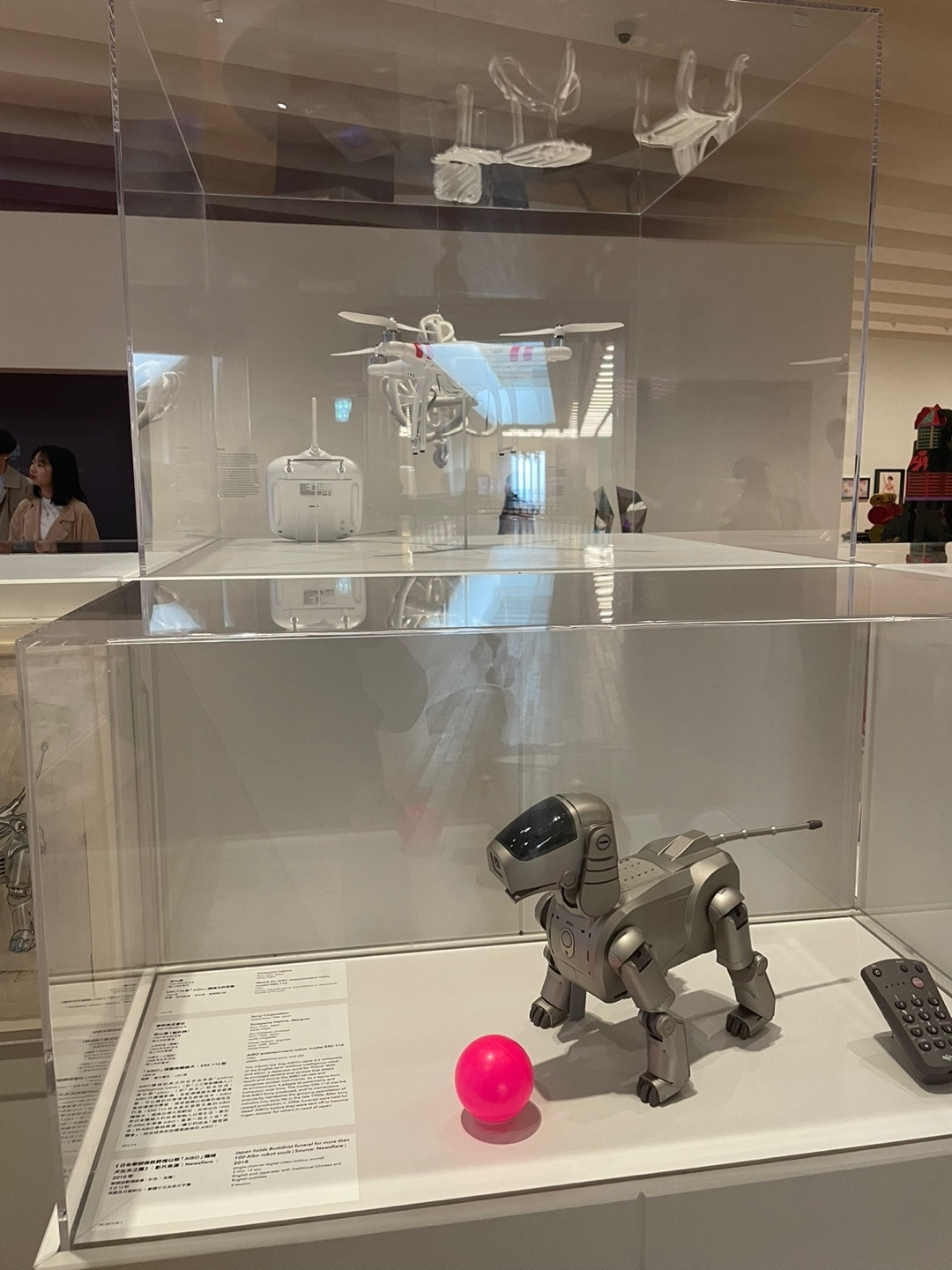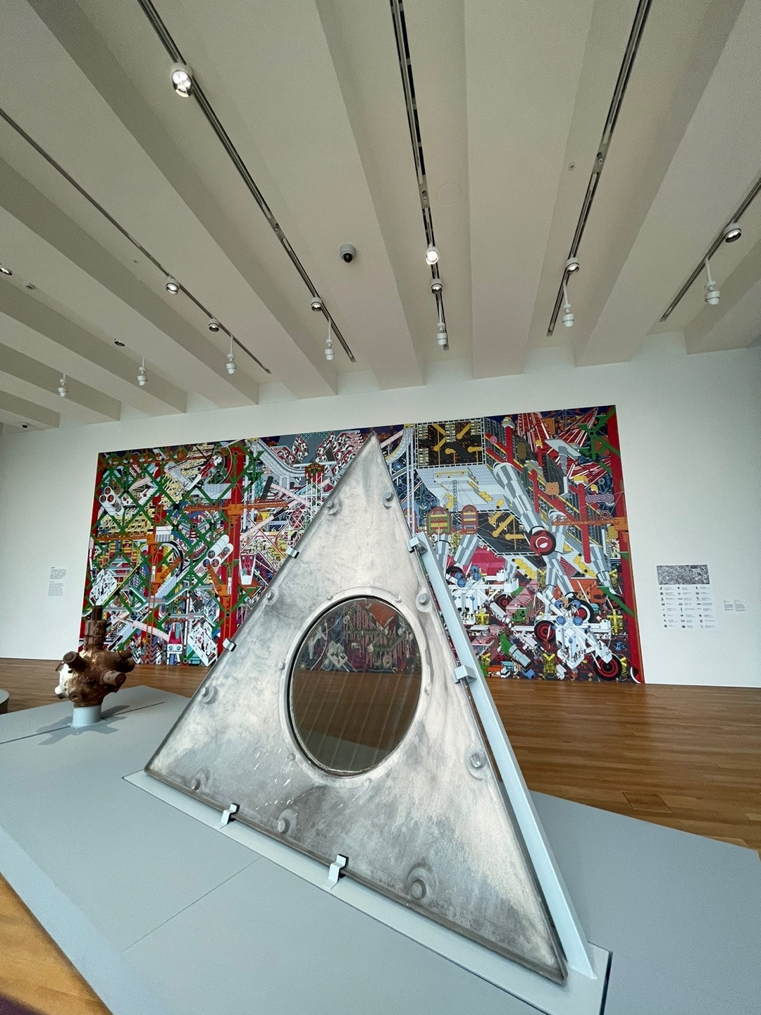 벽면에는 중국의 건축 스튜디오 드로잉 아키텍처가 커미션 작업의 일환으로 과거와 현재를 연결하는 콘셉트의 대형 벽화를 설치했다. 또 마치 조각처럼 설치된 삼각형 패널은 1970년 일본 오사카 국제박람회의 엑스포 타워 ‘카빈’에서 추출한 건축 재료다. 설계자이자 메타볼리스트 무브먼트를 이끈 창립 멤버 중 하나인 Kikutake Kiyonori는 타워가 철거된 이후 이 패널을 보관하고 있다가 엠플러스에 제공했다. 오사카 국제박람회는 전후 테크노-퓨처리스틱 건축을 선보이는 쇼케이스로 기능했다는 점을 강조하기 위한 설치물이다.