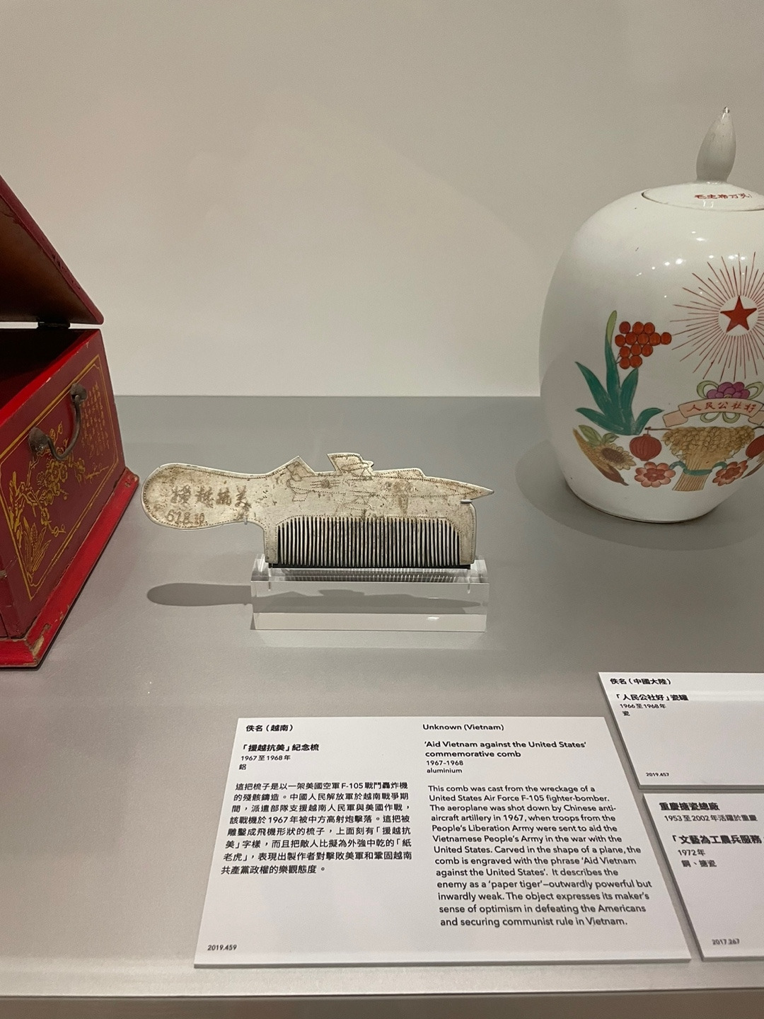 일본의 제국주의적 야심을 엿볼 수 있는 사물로 남성 기모노의 일종인 하오리(겉옷)가 전시됐는데 안감에 일본 전투기(가미카제)를 그려 넣은 부분이 섬뜩하게 다가온다. ‘베트남을 도와 미국에 저항하자’라는 한자가 음각된 기념품용 빗은 1967~1968년 생산된 것이다. 손잡이 부위에 미국 전투기 에어포스 F-105의 형상을 주조했다. 이 전투기 기종은 베트남 전쟁 당시였던 1967년 중국 대공포화가 격추시킨 모델이다. 당시 중국의 인민해방군은 전쟁 중 베트남 인민군을 원조하기 위해 베트남으로 파견되었다. 이 빗은 당시 중국군이 지니고 있었던 것으로 미군이 겉으로는 강해 보이지만 실제로는 ‘종이호랑이’처럼 약하다는 것을 비유적으로 표현한 사물이다.