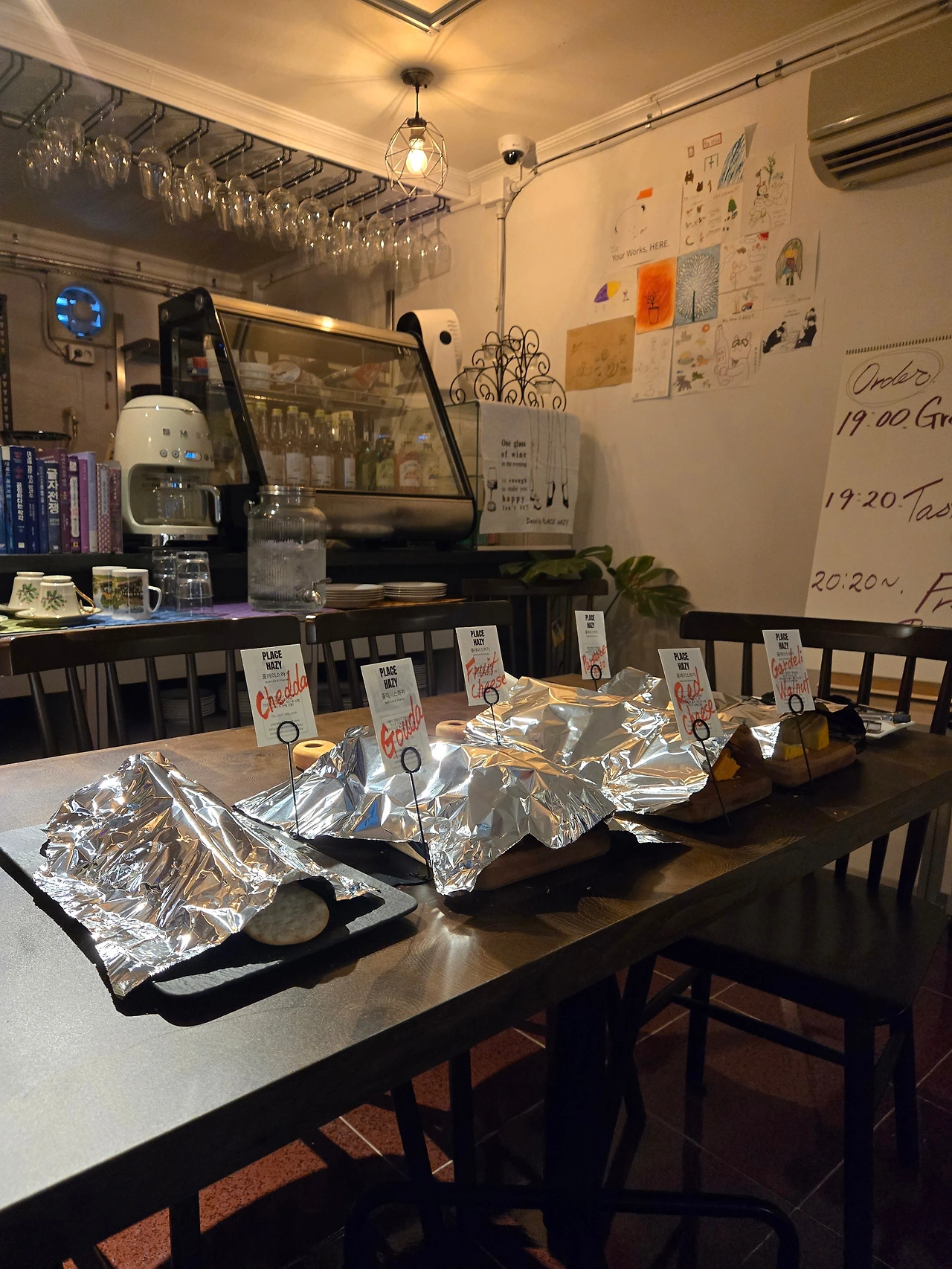 오전엔 가게를 청소했다. 뭔가 대단하게 꾸미는 것보다 테이블 밑, 책장, 진열대 등에 먼지 없이 깔끔한 게 더 중요하다는 생각에 나름 꼼꼼하게 여기저기를 닦았다. 점심은 햄버거로 때우고 행사 성격에 맞게 테이블을 재정렬했다. 자체 제작(?)한 와인 테이스팅 노트를 프린트해 테이블에 올려놓는다.