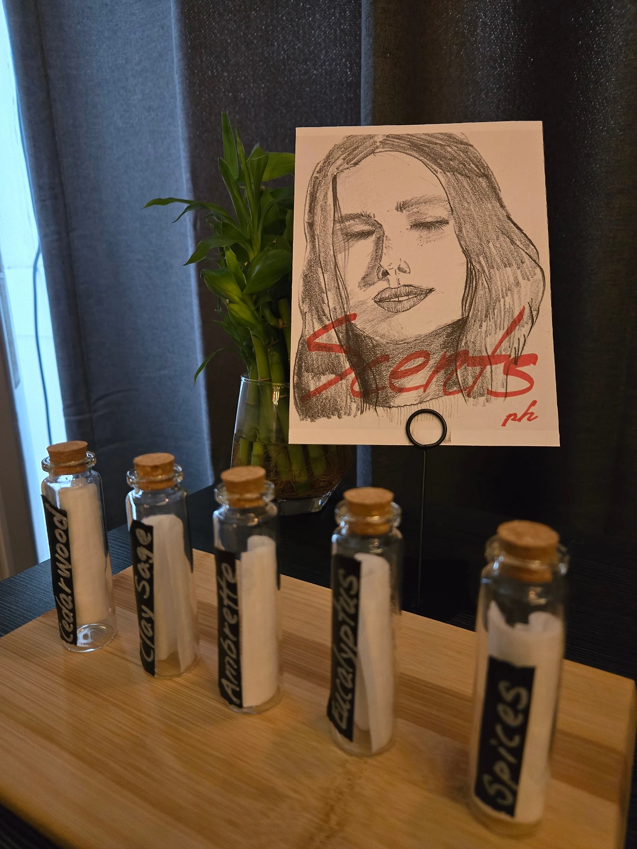그래서 이번 시음회를 위해 열 가지 각기 다른 향의 시향 베이스를 구입했다. 레드와인의 아로마와 풍미를 묘사할 때 흔히 언급되는 푸르티 계열의 향 다섯 가지(라즈베리, 스트로베리 등)와 기타 다섯 가지(육두구, 제비꽃 등)를 준비해 솜을 넣은 유리병에 몇 방울 떨어뜨려 시향을 위한 준비를 마쳤다.