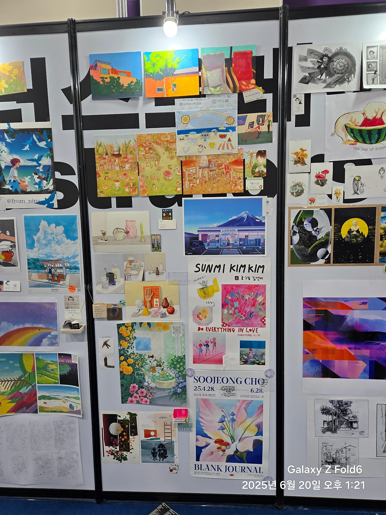 전시 참여를 위해 설치된 가벽에는 이미 그림에 관련한 ‘업’을 가진 사람들이 자신들의 작품과 포트폴리오, 그리고 각자의 명함이나 연락처를 벽에 붙여 놓았다. 모두 하나 같이 드로잉, 일러스트 실력이 대단하다. 진행요원에게 물어보니 전시회 종료 후 가벽에 붙인 그림들을 모두 수거해 출판 관계자들이 모여 이들을 심사하는 절차를 거친단다.