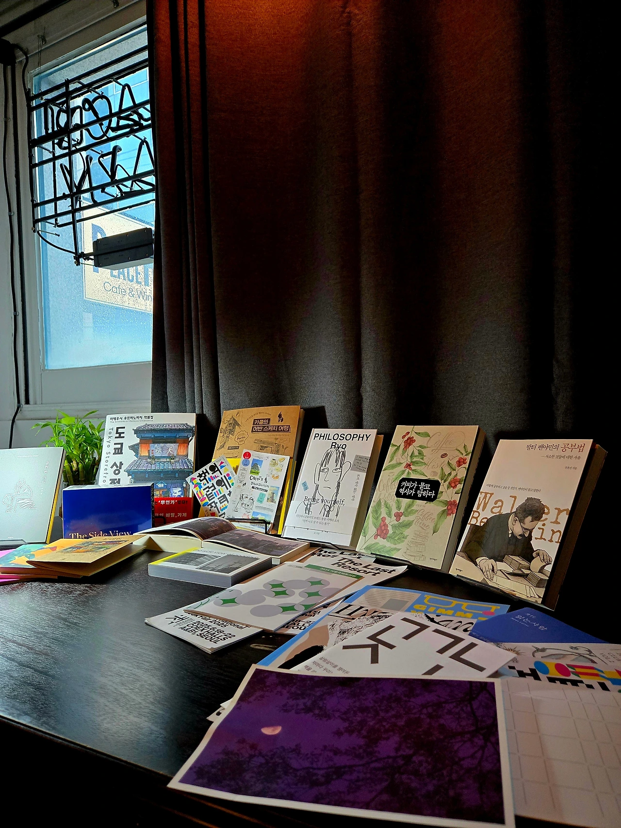 가게로 돌아와 구석진 자리 2인 테이블에 오늘 산 책들과 이곳저곳에서 입수한 홍보물을 진열하고 사진을 찍는다.