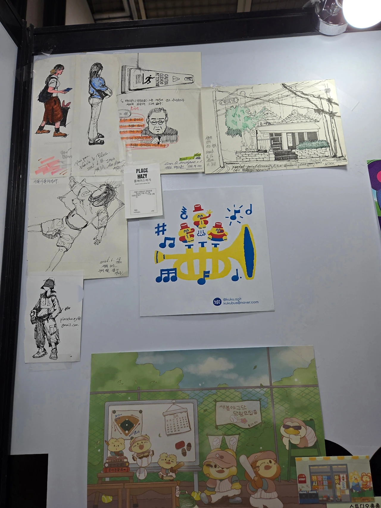 아차, 이런 이벤트가 있는 줄 알았다면 내 그림 중 잘 그린 그림 몇 장을 출력이라도 해서 가져올걸. 아쉬운 마음에 입맛만 다시다 문득 생각이 나 가방에서 평소 가지고 다니던 스케치북을 꺼냈다. 돌아다니다 틈이 나면 이런저런 그림들을 그려놓았던 노트다. 괜찮은 그림 몇 장을 골라 페이지를 북북 찢어 스카치테이프로 가벽에 붙이고, 옆에 내 명함도 붙였다.
