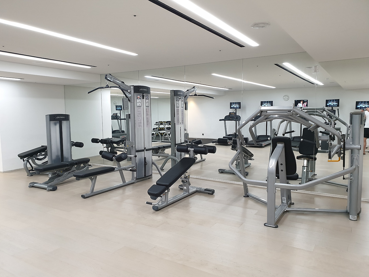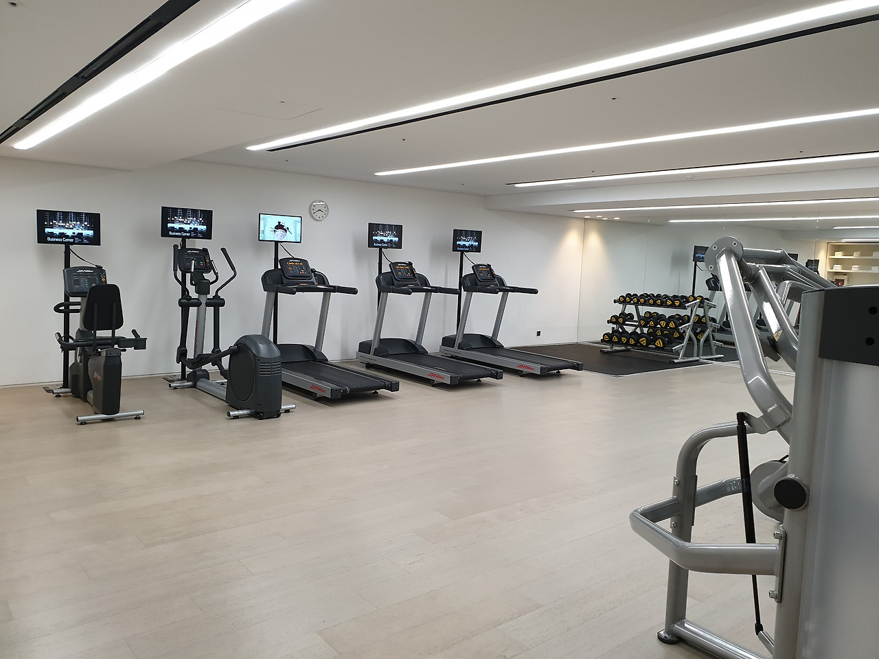운동기구들이 많지는 않지만 가볍게 운동하기에는 무리가 없다. 체스트 프레스, 인클라인 벤치, 팻 풀다운, 평 벤치, 레그 프레스, 트래드 밀과 사이클 머신, 그리고 덤벨 스탠드가 적당한 간격을 두고 자리를 잡고 있다.