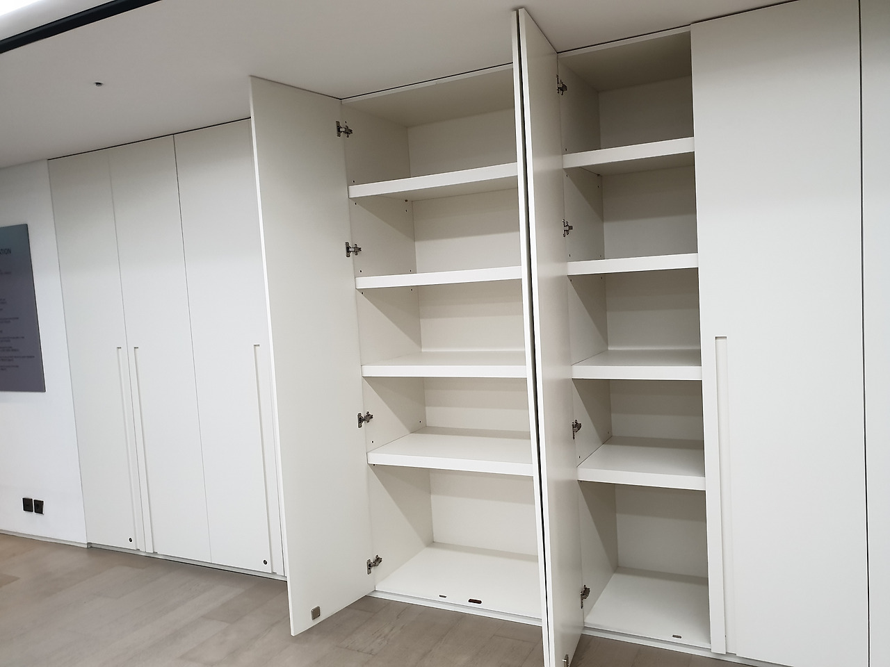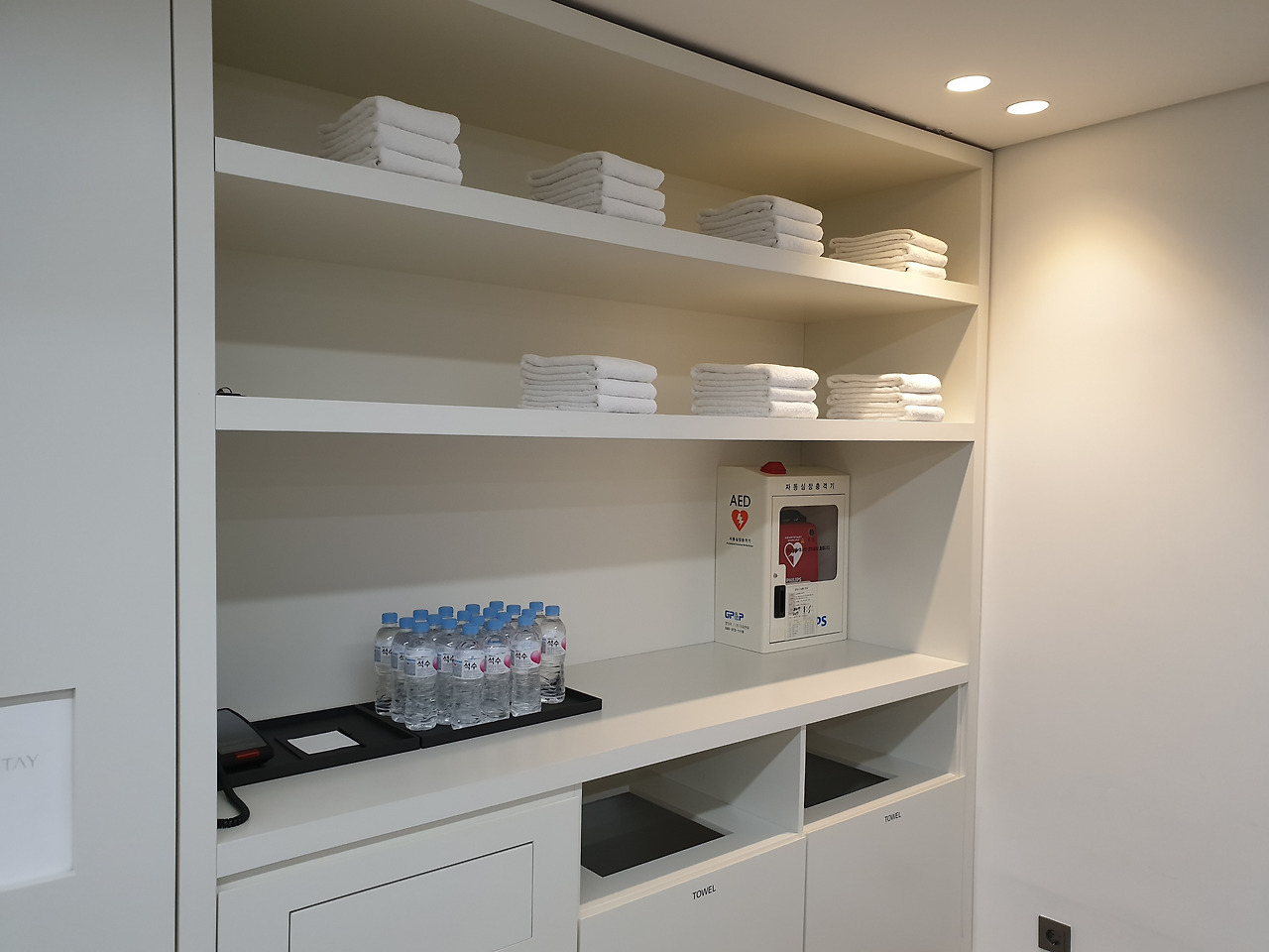 창문이 없이 4면이 벽이다 보니 공간은 약간 답답한 느낌을 주었다. 하지만 화이트톤의 수납장과 벽면 한편에 깔끔하게 비치된 생수와 수건이 눈에 띈다.