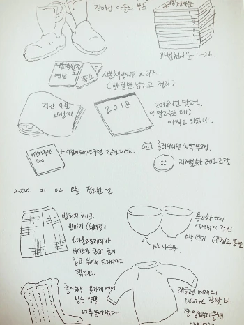 마침 새해도 되었겠다, 새해 목표를 '하루 하나 버리기'로 삼았다. 버리는 물건을 그림으로 남기자는 거창한 계획도 세웠다. 버리기 아쉬운 물건이라면 좋은 기록이자 추억이 될 것이고, 아쉽지 않은 물건이라면 '이런 걸 왜 가지고 있었대!'라며 정리에 더욱 채찍질을 해 줄 것이다. 첫 공략 대상은 책장이었다. 몇 해 전 대대적인 정리를 하여 콤팩트한 사이즈로 존재하는 책장이었는데 그새 또 뭔가가 틈을 비집고 들어서 있었다. 여기서도 발견되는 의외성과 희소성에 마음의 결정을 내리기가 어려웠지만 거의 3kg에 육박하는 종이를 버릴 수 있었다. 다음은 신발장. 아이에게 작아진 신발은 손쉬운 퇴출 대상이다. 주변에 나눠줄 것, 아름다운가게에 가져갈 것 등을 추려냈다. 이튿날엔 옷장과 그릇장을 열었다. 사이즈가 맞지 않음에도 아쉬워서 계속 착장을 시도하던 빈티지 치마바지를 덜어내고 분가할 때 얻어왔던 무거운 그릇을 끄집어냈다. 그러다 보니 안 보였던 옷도 다시 발견하고 처박아두어 깜박했던 그릇도 찾을 수 있었다. 기분 좋은 의외의 순간을 우리집에서 만났네. 우리집이 중고 시장이네 그래.