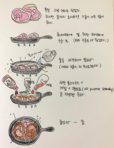 이 요리는 앞뒤로 조금 굽다가 물과 양념을 넣고 졸이는 게 포인트다.