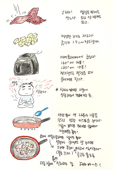 몇 번 하다 보니 감이 왔다. 포인트는 '익힌 고구마를 식힌 뒤 설탕 시럽 코팅!'이 되겠다.