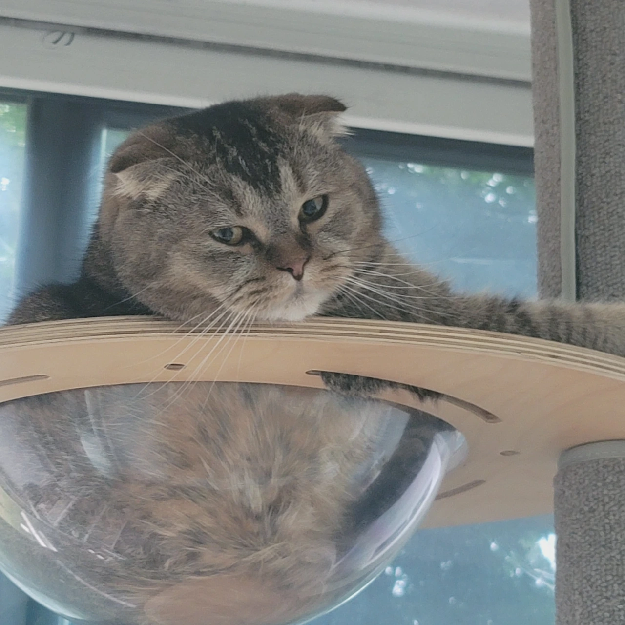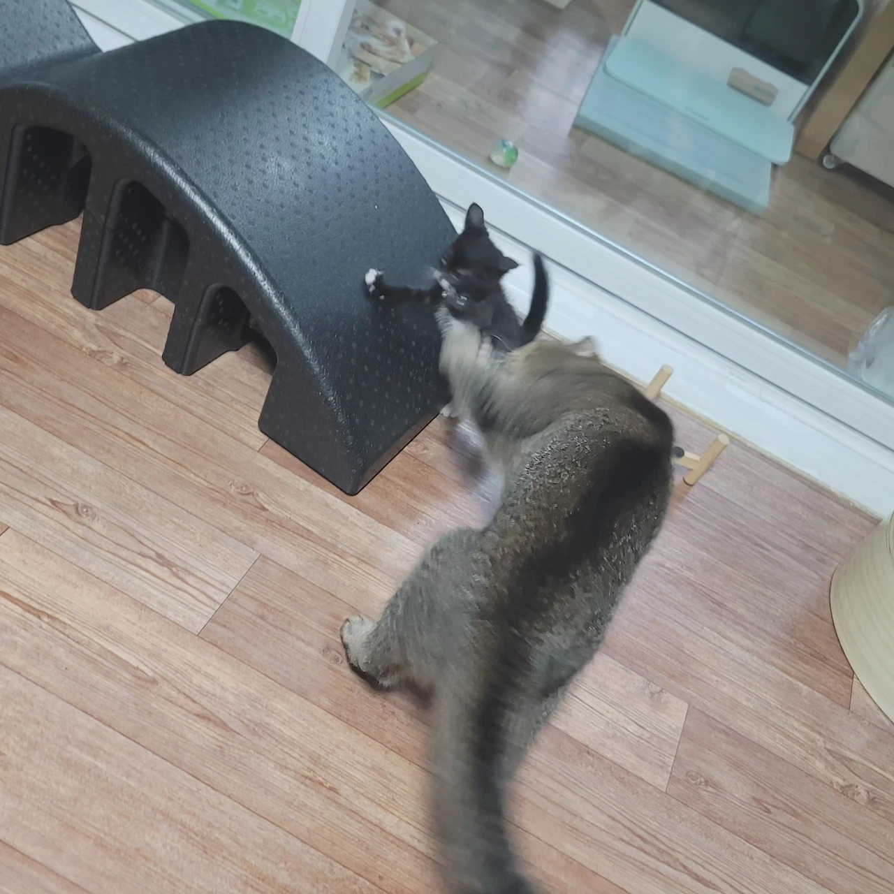 흑미가 아침부터 놀고 있는 동안 온이는 흑미가 절대로 오를 수 없는 캣타워의 가장 높은 칸에서 지켜본다.