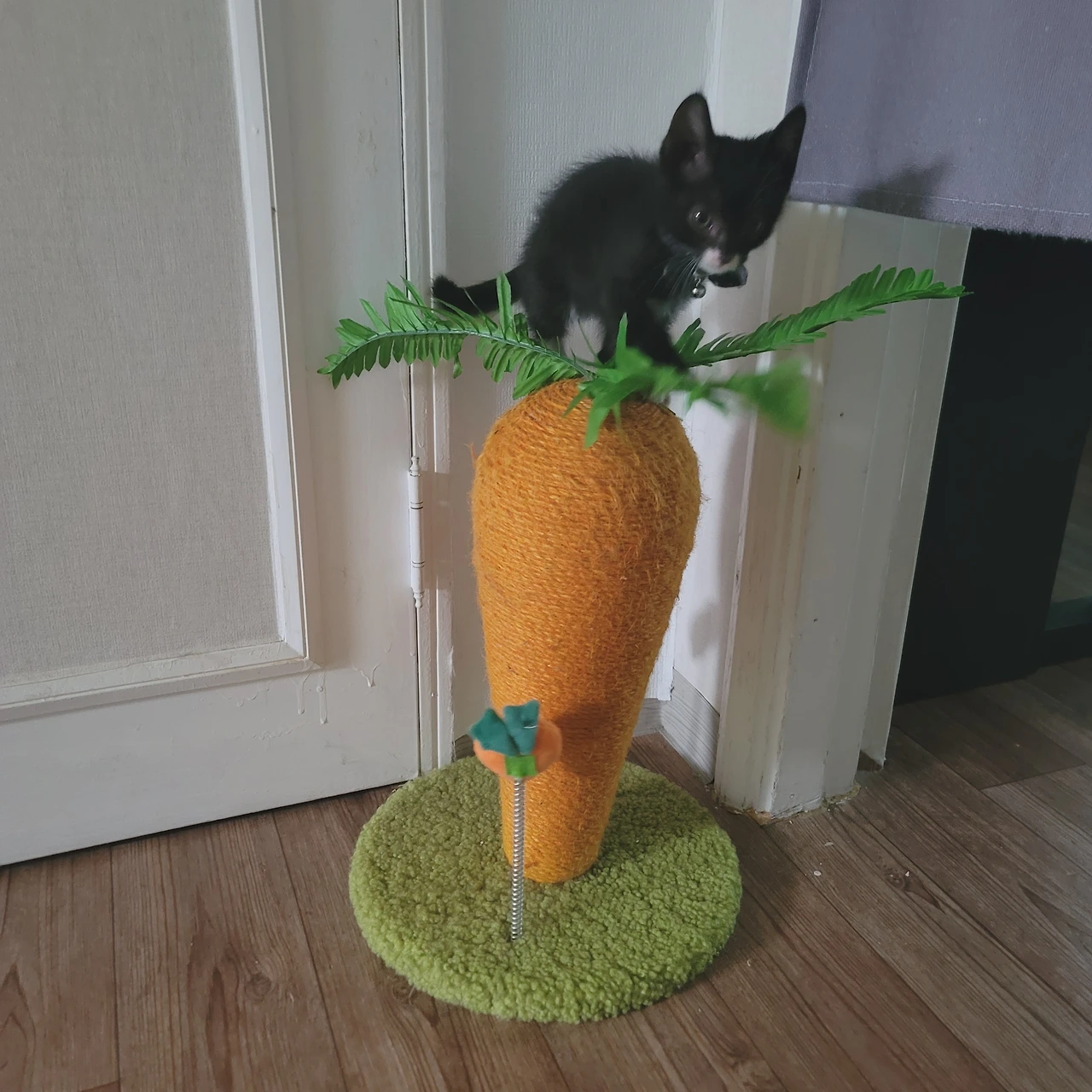 온이가 아침마다 기지개를 켜는 당근 스크래쳐에 작은 흑미는 등산을 하듯 오르는 것이 취미이다. 정말 여러모로 온이와는 다르다.