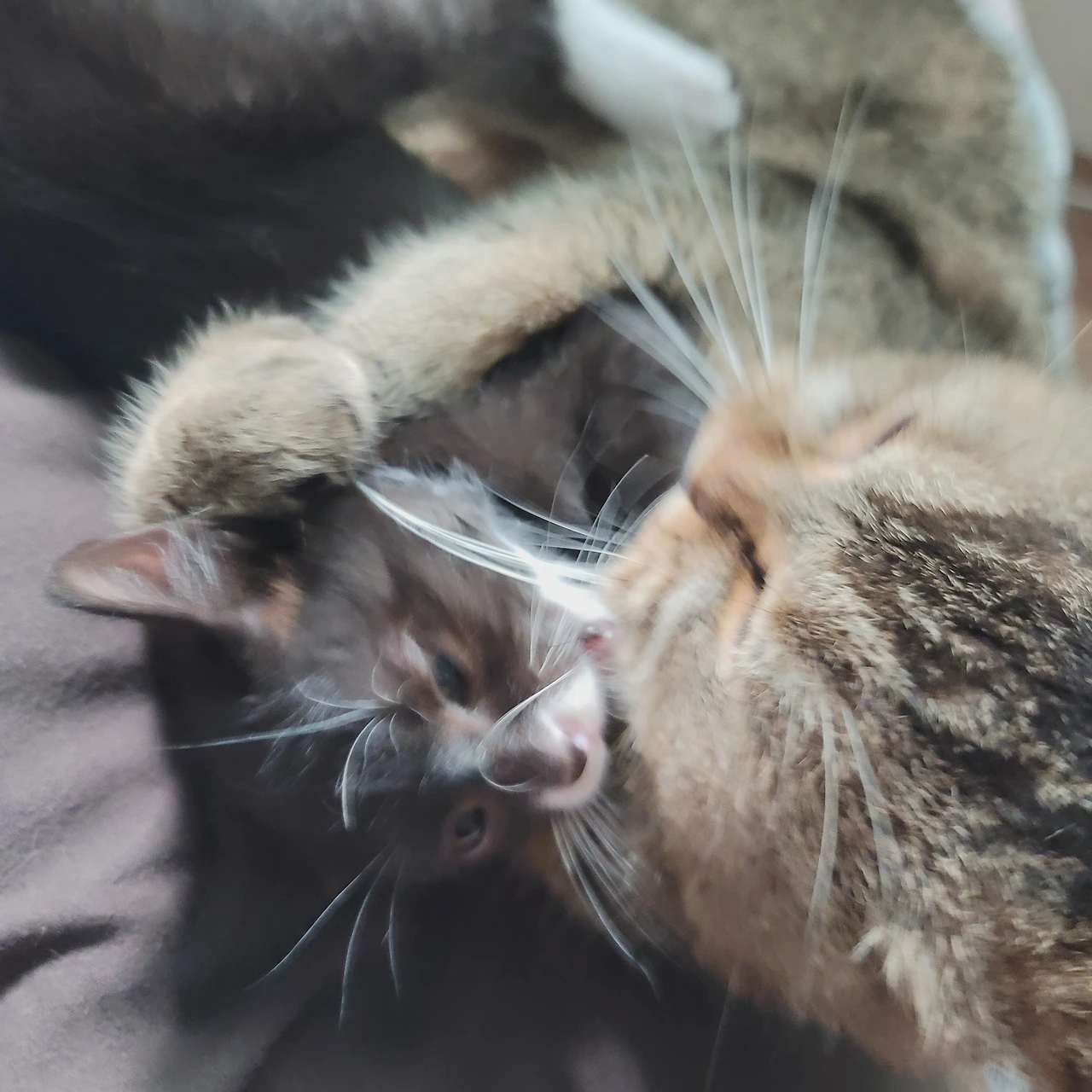 우리 집에와서 하악질 한번 안하던 온이가 흑미에게는 하악질을 하곤 한다. 그 정도로 온이가 앉아있거나 하면 온이 위를 올라가거나 일부러 건들어 보곤 한다. 온이가 형으로써 인정할 만한지 계속 테스트를 해 보는 듯 하는 느낌이 든다. 아니, 니가 뭔데...? 태어난지 2개월 밖에 안된 고양이가 참....