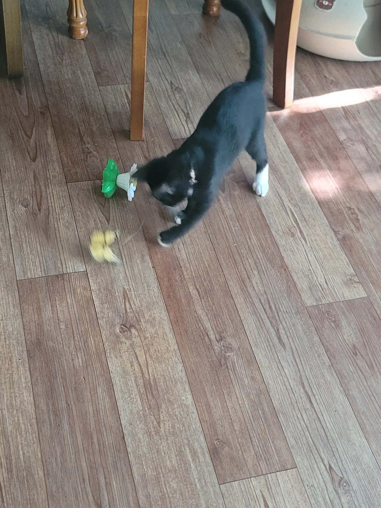 온이 때에 많이 사준 장난감들은 그리 활약을 하지 못한 채 집 한 구석을 장식하듯이 놓여있었다. 하지만 흑미가 물려받아서 흑미혼자 2 묘분(두 마리분)으로 놀고 있다. 사진 속에 있는 장난감도 자동으로 나비가 빙글빙글 도는 타입의 장난감인데, 얌전한 온이가 조금은 신기해했으면 하는 마음에 사 준 것이다. 하지만 처음에만 신기해할 뿐 아무리 열심히 빙글빙글 돌려도 온이는 그저 쳐다보기만 할 뿐 이렇다 할 움직임은 없었다.