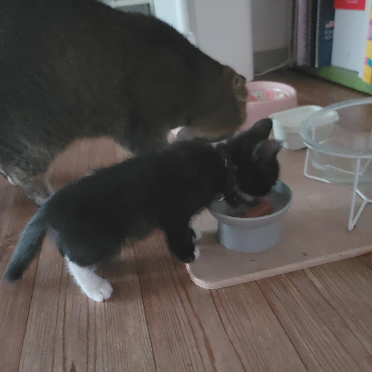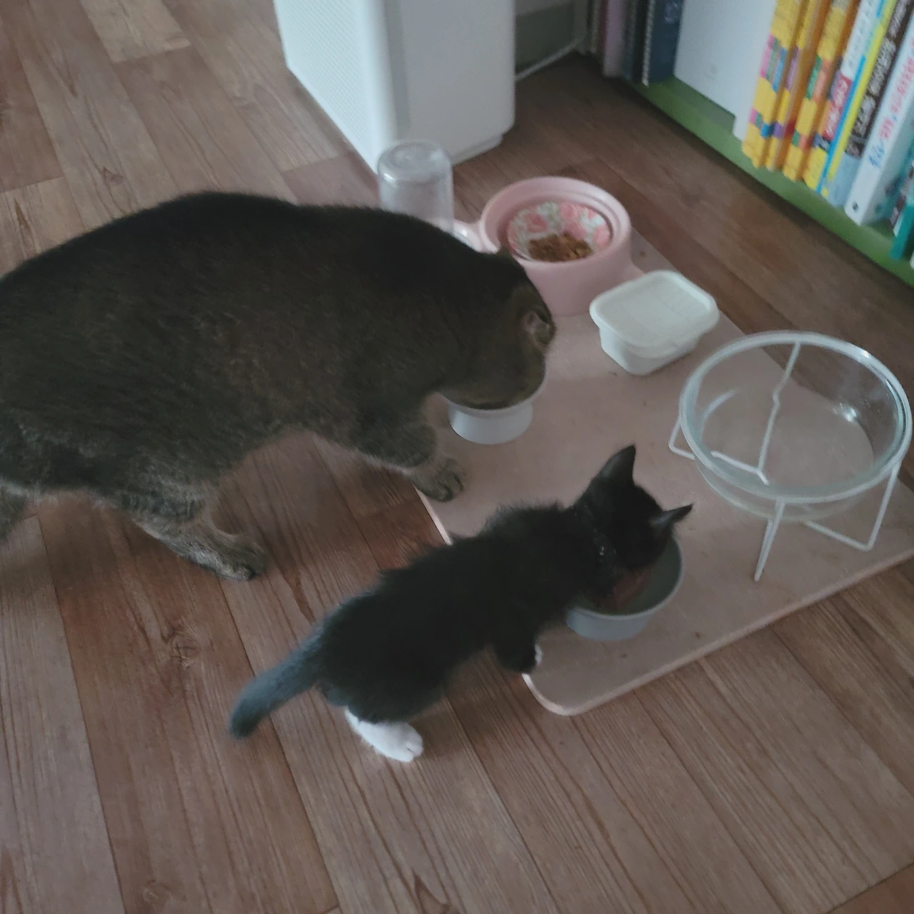 온이는 하얀 그릇, 흑미는 회색 그릇에 습식사료를 반포씩 넣어서 준다. 입이 짧은 온이에게 맞춘 양이지만 아직 어린 흑미에게도 딱 양이 적당한지 먹고 나면 만족스러운 얼굴을 한다. 처음에는 서로 바꿔 먹기도 하고, 흑미가 온이밥을 빼앗아 먹고 빼앗긴 온이는 가만히 있어서 다시 줘야 하고 했는데 이제는 자신의 밥을 잘 찾아간다.