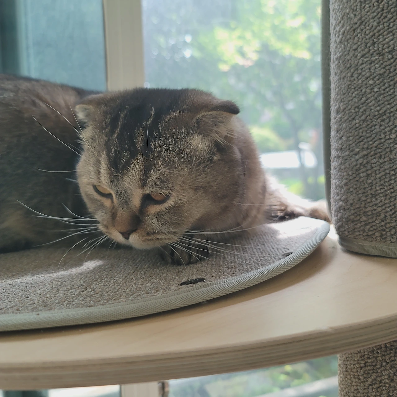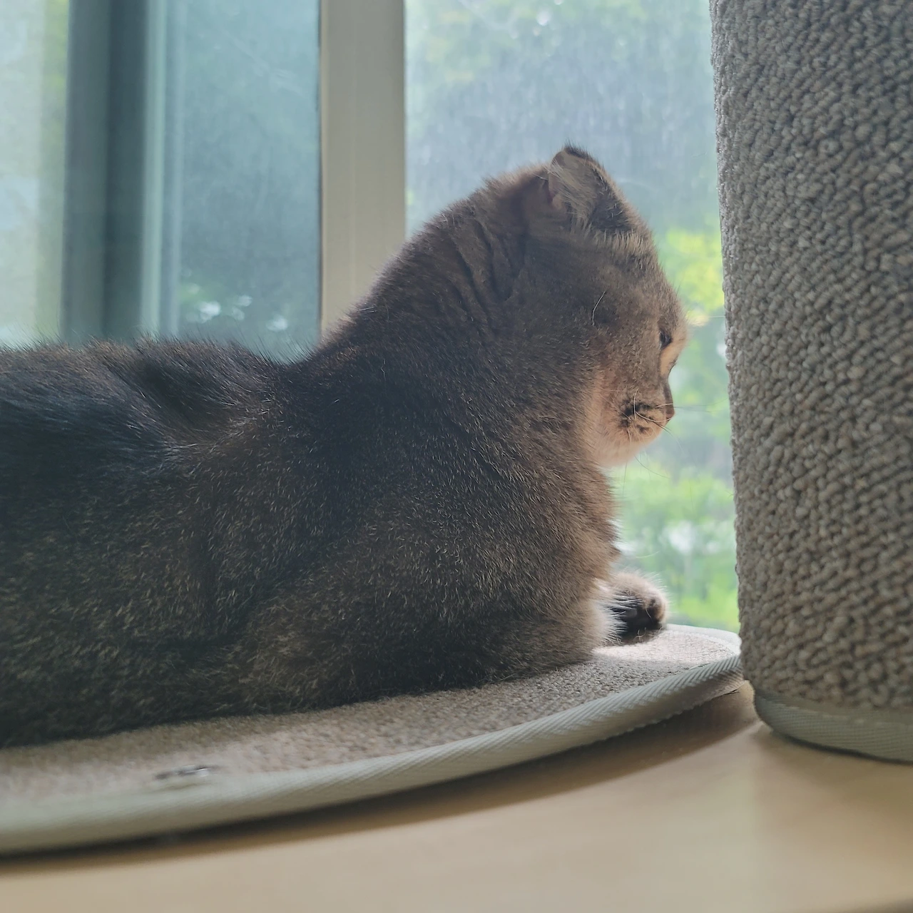 우리 집은 1층이고 아파트 내에서도 안쪽에 위치한 곳으로 집 앞은 작은 쉼터와 같은 공간이 있다. 평상이 있지만 사람들이 많이 찾지 않는 그런 공간은 정원이 없는 우리 집으로서는 나만의 개인 정원 같은 기분을 느낄 수 있다. 그래서 그런 공간이 보이는 앞쪽 베란다 쪽에 온이의 캣타워를 설치해 주고 온이가 앉을 수 있는 공간을 마련해 주었다.