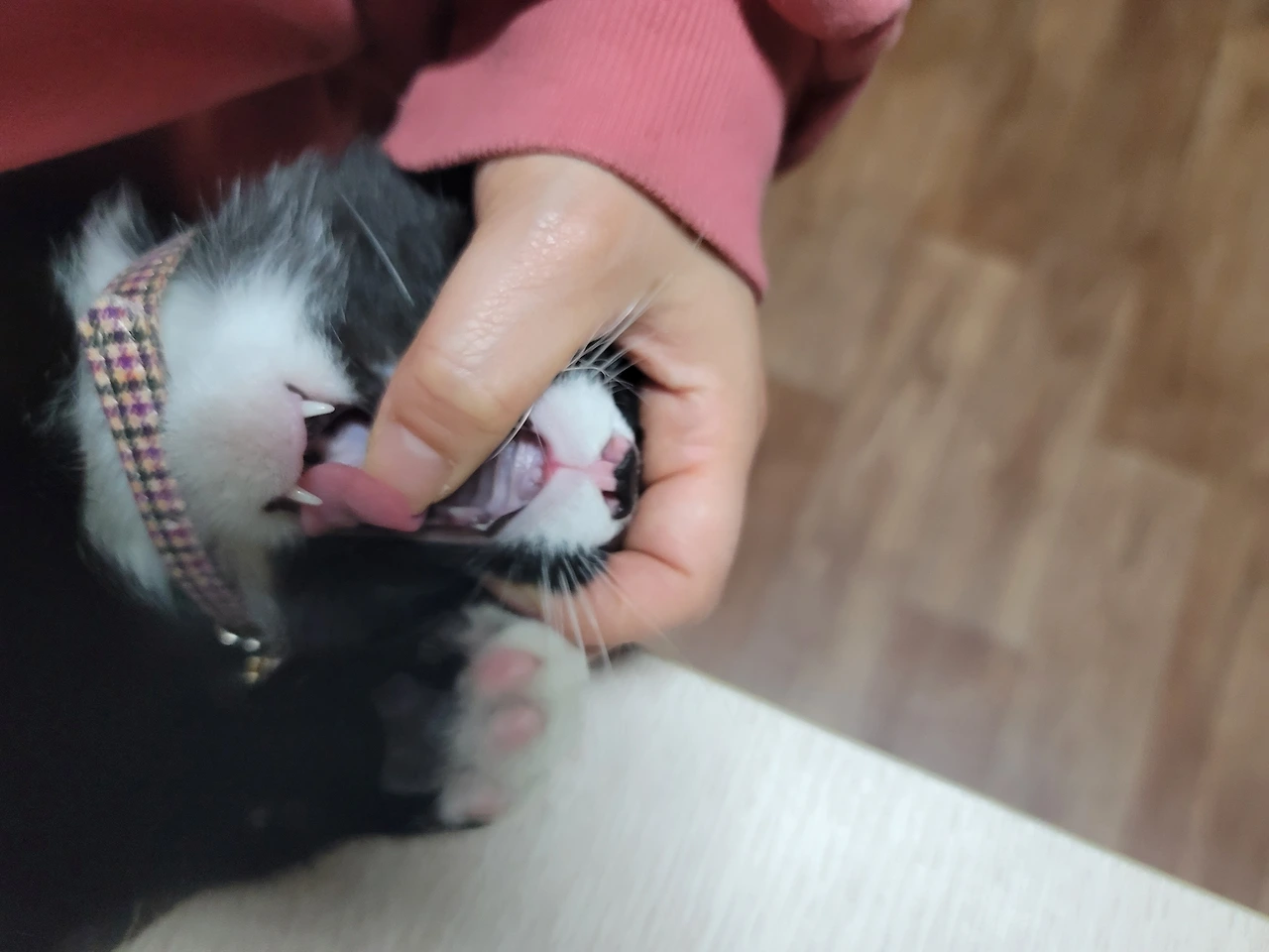 고양이에게 있어 양쪽 이빨이 없는 것은 약간 웃기게 보인다. 하지만 집 고양이에게 앞니빨이 얼마나 큰 역할을 하는지 잘 모르겠다. 기껏해야 사료를 먹는 것뿐이지 않는가? 그래도 귀여운 이빨이 뭔가 나에게는 필요 없지만 소중하다.