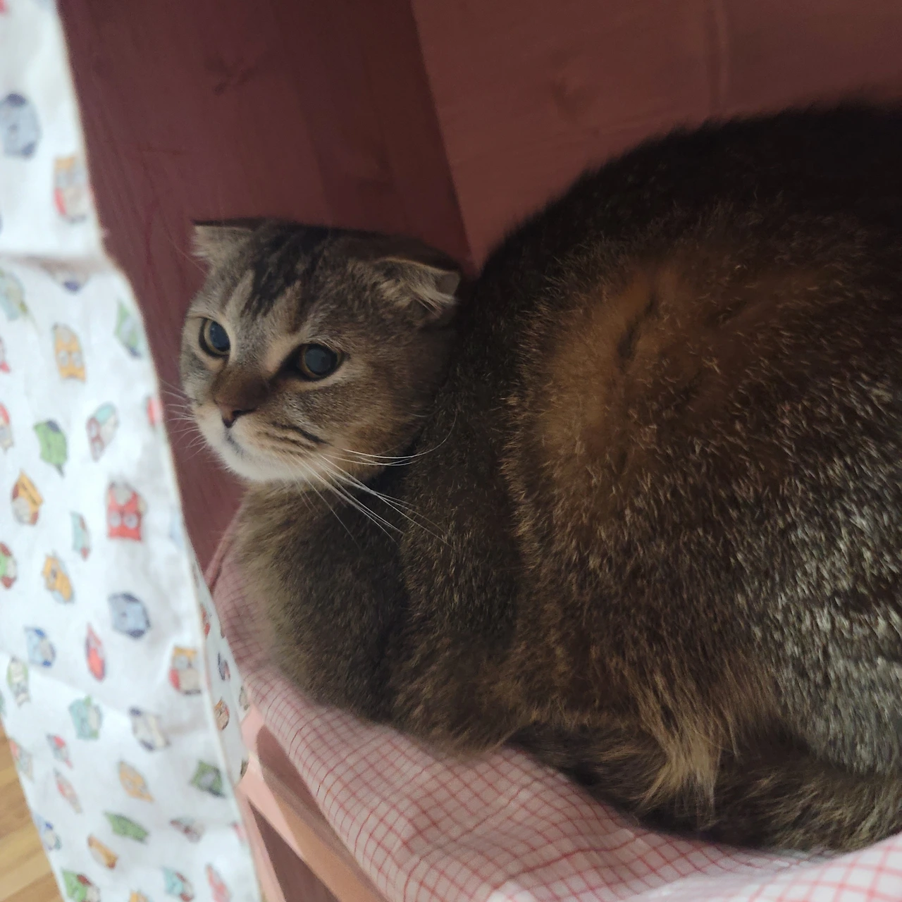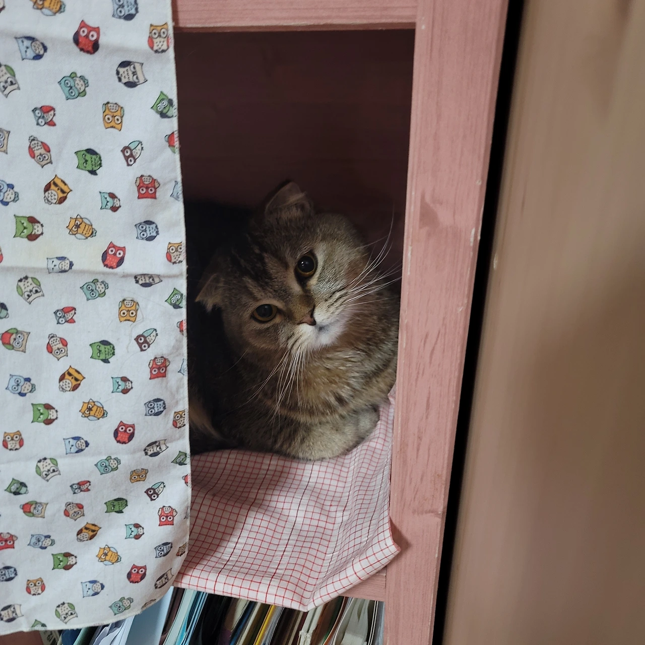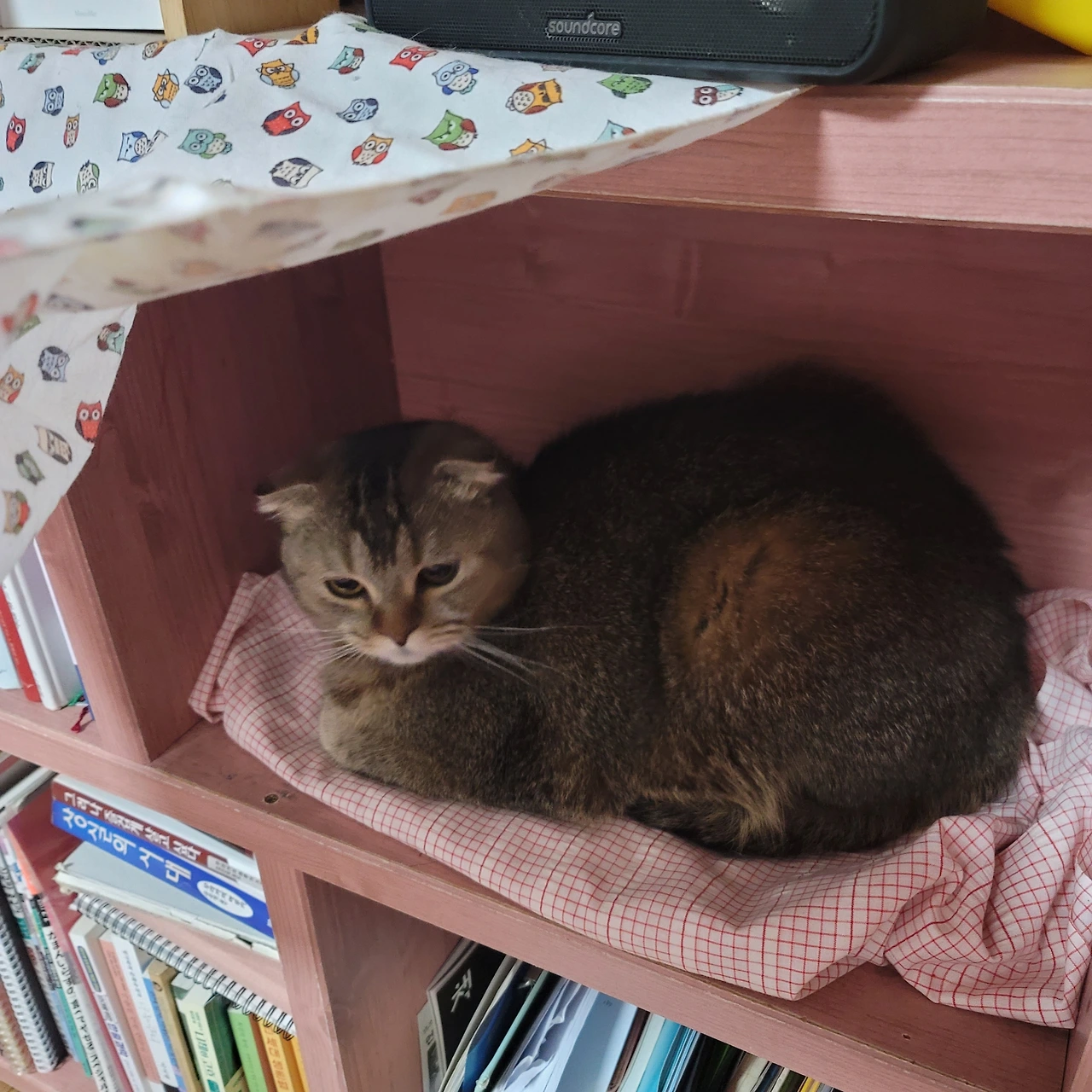 내 책상 옆에 길게 놓여있는 책꽂이의 한켠에, 내 옆에 있기를 좋아하는 첫째 아들(고양이 온이)을 위한 자리를 마련해 두었는데, 그곳에서 나는 소리다. 얌전하게 앉아 구경하는 것을 좋아하는 온이는 곳곳에 숨숨집을 마련해 주는 것을 좋아하는데 특히 내가 작업을 하고 있는 근처를 좋아하는 듯했다.
