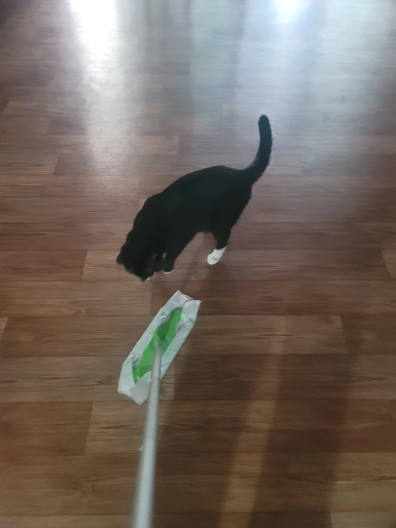 아침이 바쁜 이유 중에 하나는 집안일인데, 고양이를 키우는 집이라면 알 수 있을 것 같다. 고양이 털이 먼지와 함께 뭉쳐져서 이리저리 굴러다니기 때문에 하루에 한 번은 부직포밀대로 밀고, 청소기를 한 번은 돌려줘야 나뿐만 아니라 아이들도 깨끗한 환경에서 돌아다닐 수 있다. 이때 앞으로 나아가지 못하게 막는 묘물이 있으니 바로 둘째인 흑미다!